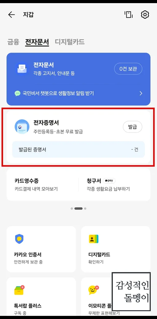 그다음 '지갑' 아이콘을 선택하면 여러 기능이 나오는데, 여기서 '전자문서'를 찾아 클릭합니다.