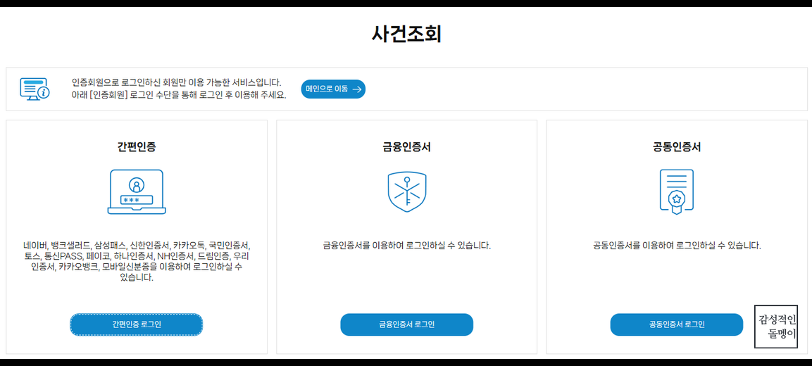 사건 조회는 본인 확인을 위해 회원가입이 필수이며, 공인인증서로 인증 절차를 거쳐야 합니다. 인증서는 개인 정보 보호를 위해 필수적이니 사전에 준비해 두세요.