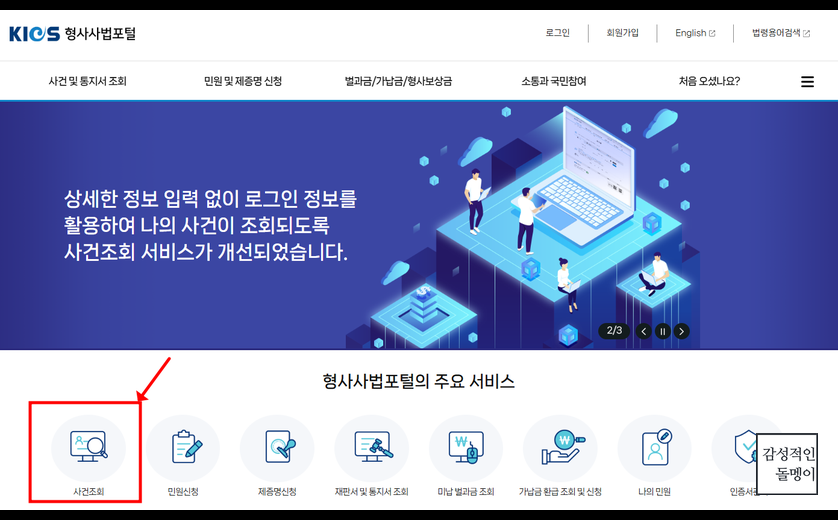 형사사법포털 메인 화면에서 '사건 조회' 메뉴를 클릭하세요. - 사건번호 입력