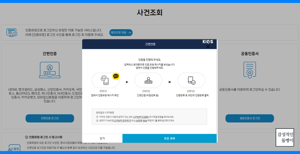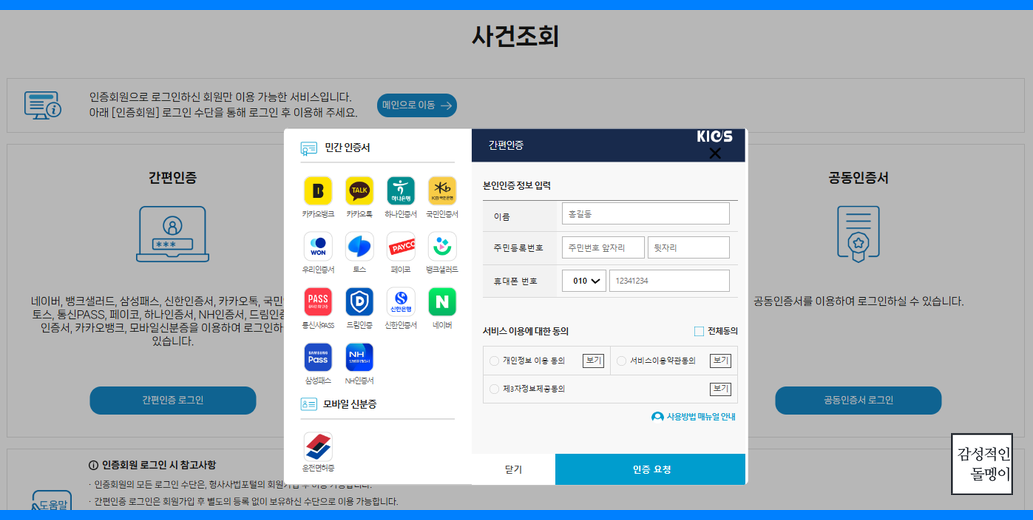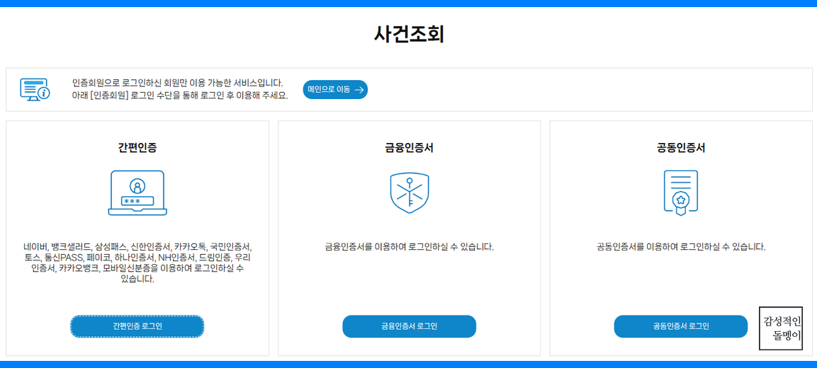 사건 조회를 위해서는 본인 확인을 위해 공인인증서 로그인이 필수입니다. 인증서가 준비되지 않은 경우 사전에 발급받아야 합니다.