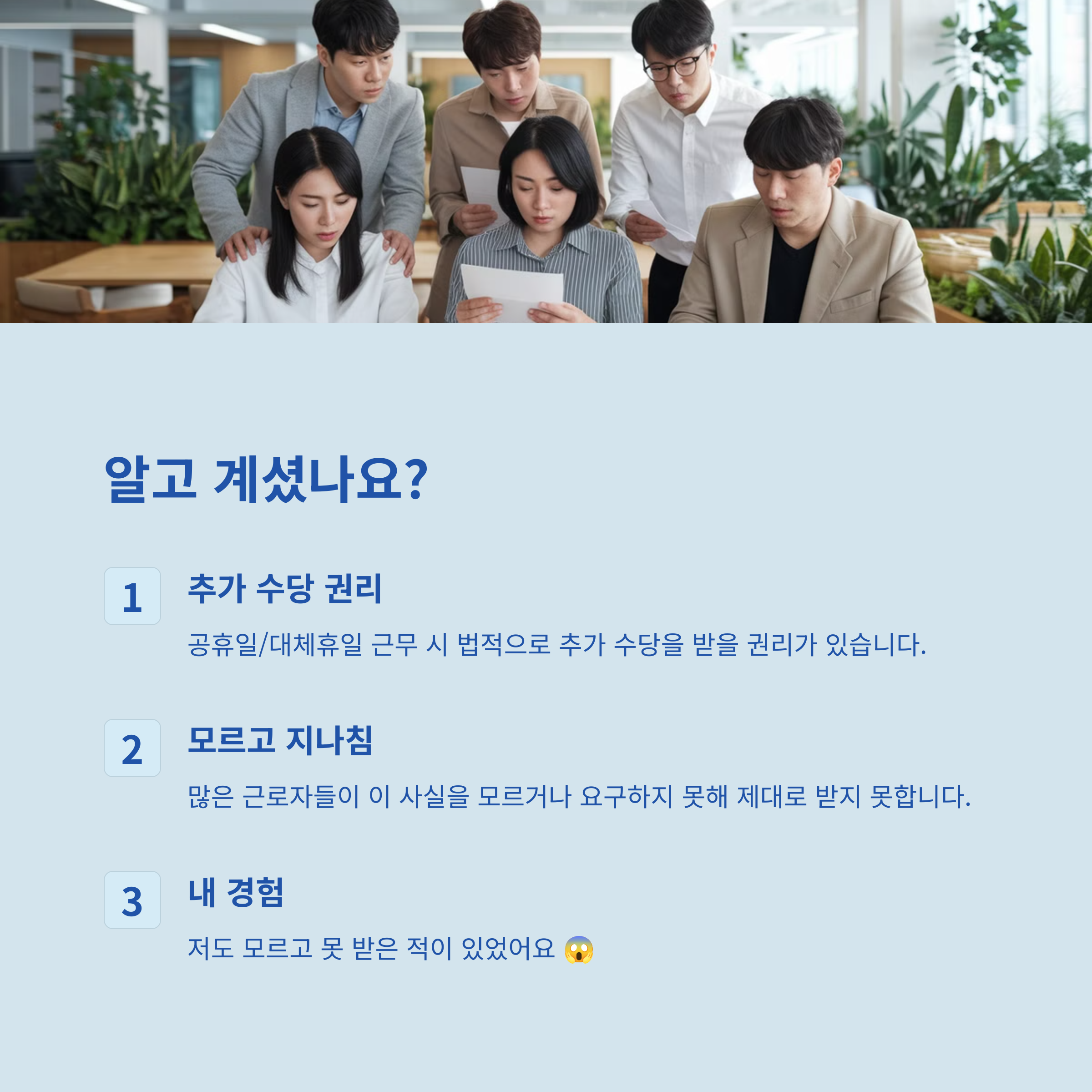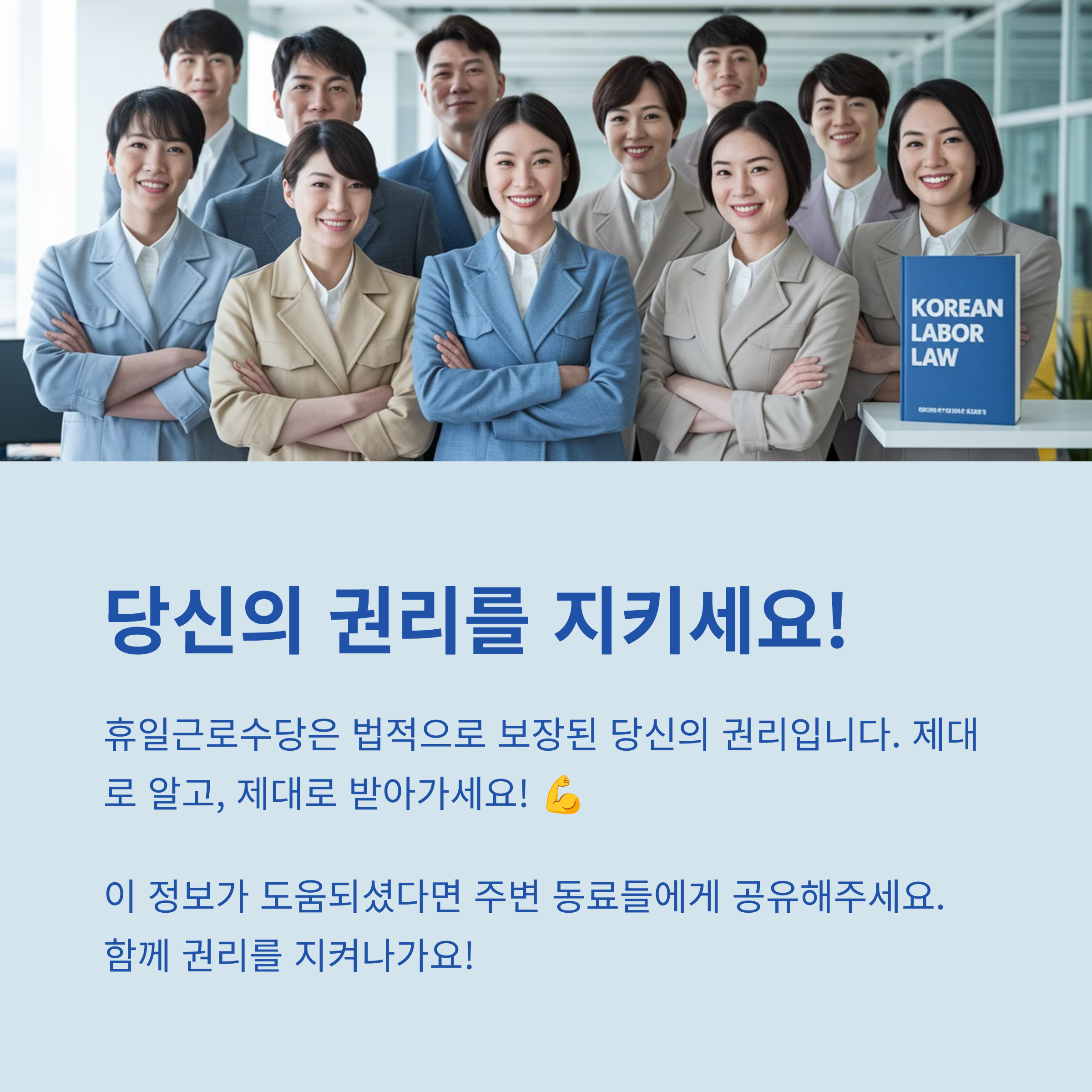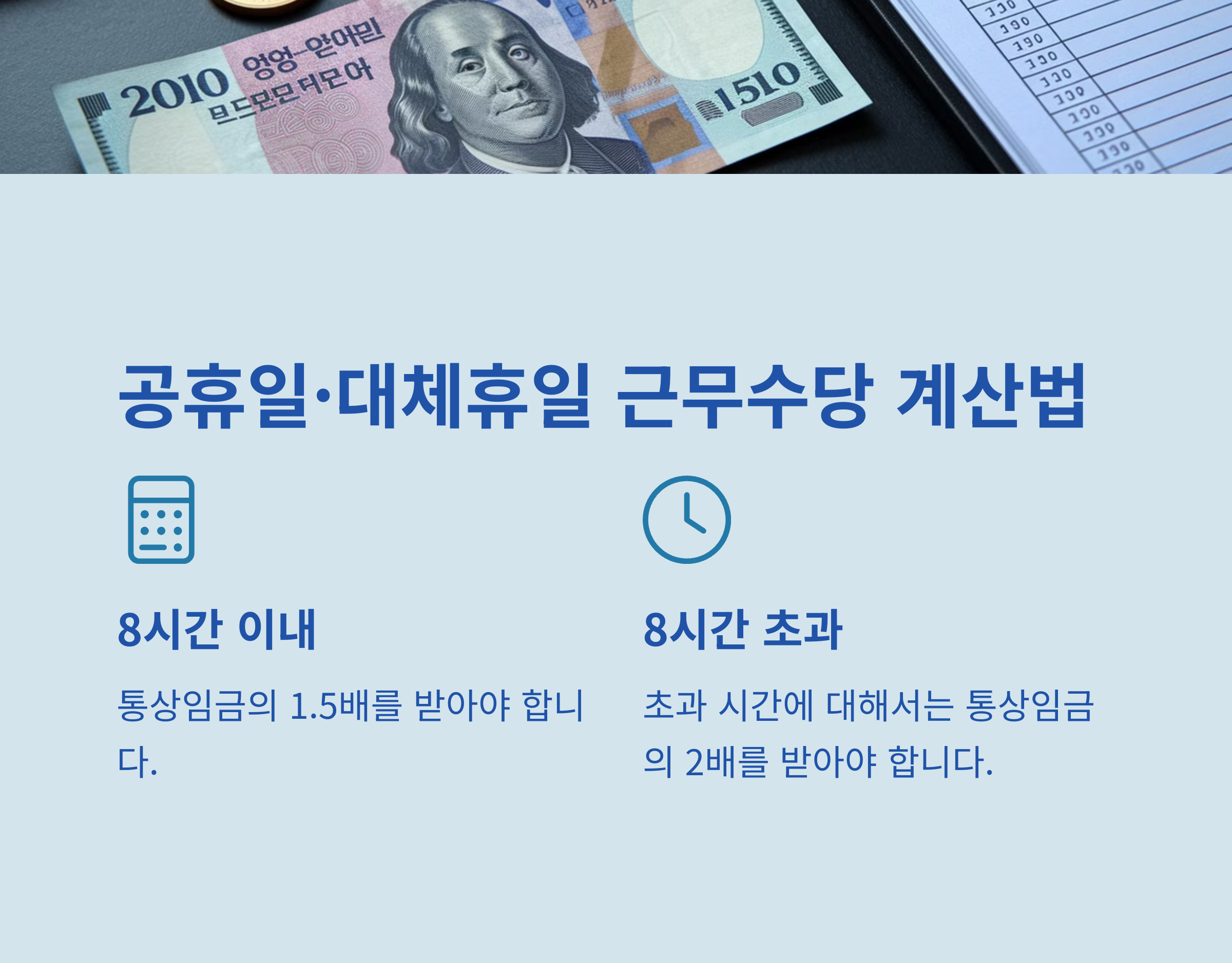 법을 모르면 손해 봅니다. 이번 기회에 공휴일 및 대체휴일 근무수당을 확실하게 챙기세요! 💪