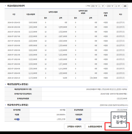 - 예상 연금액: 현재까지의 납부 내역을 기준으로 예상되는 연금 수령액을 확인할 수 있습니다.