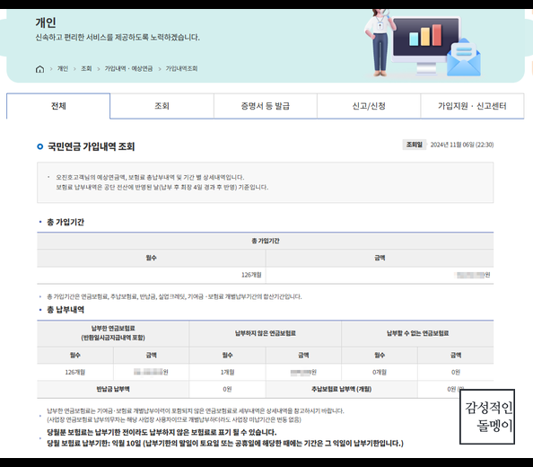 - 예상 연금액: 현재 납부 내역을 기준으로 향후 연금 수령 시 받을 예상 연금액을 확인할 수 있습니다.