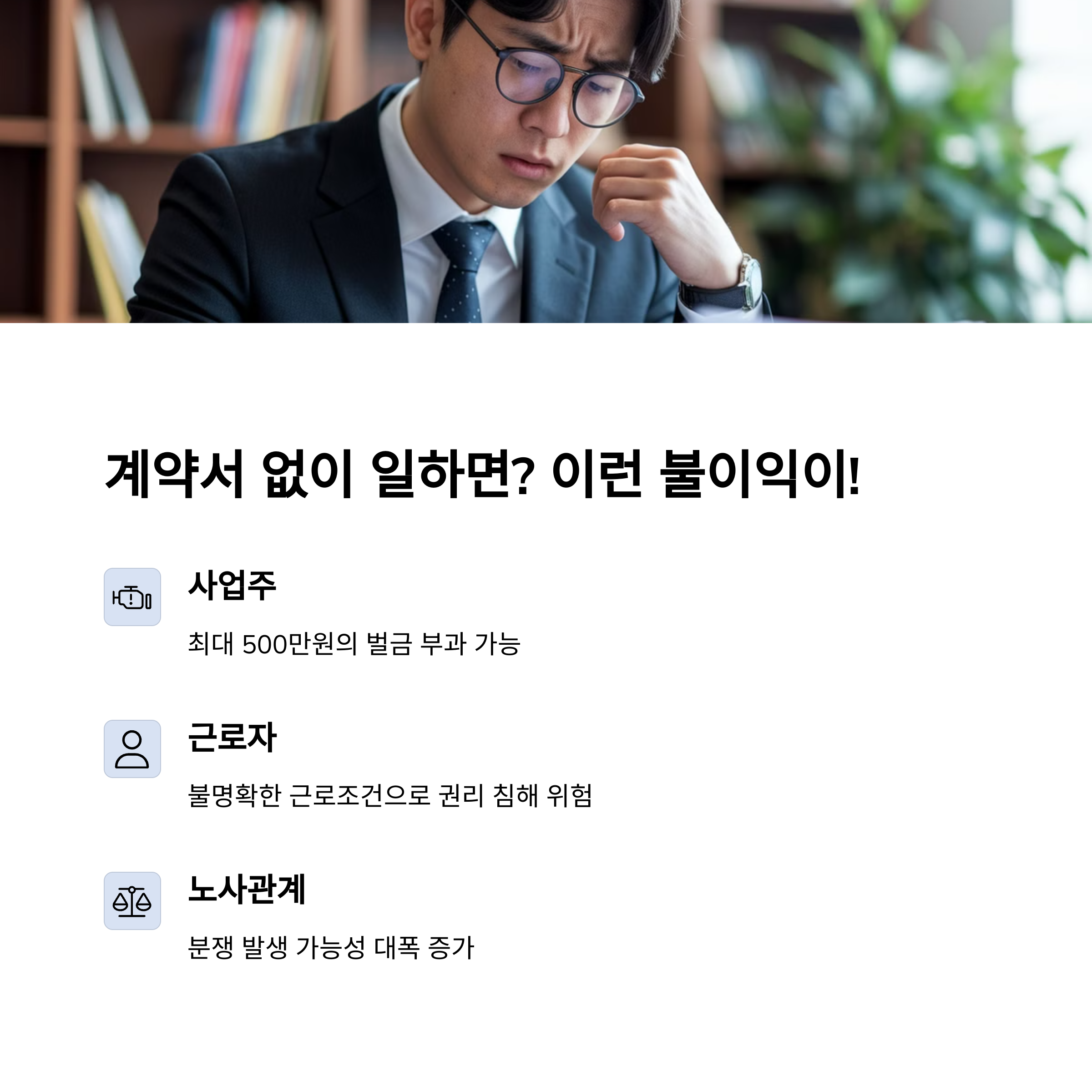 - 법적 의무: 근로기준법에 따라 서면으로 작성해야 하며, 이를 위반할 경우 벌금 등의 처벌을 받을 수 있습니다.