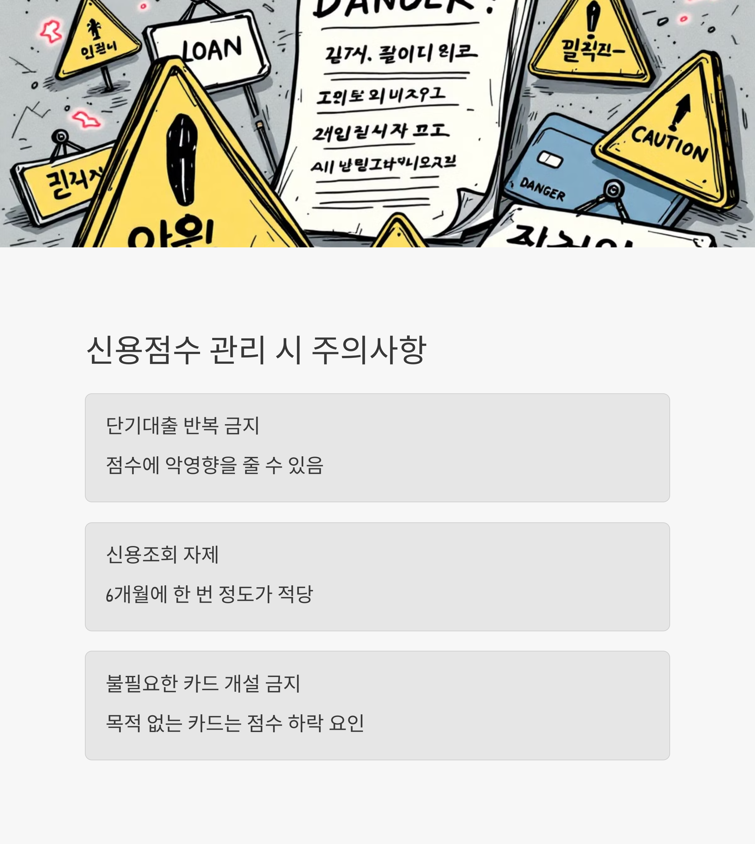 이런 건 오히려 점수에 악영향을 줄 수 있으니, 꼭 목적을 갖고 행동해야 합니다. 신용조회도 가급적 자주 하지 마세요. 6개월에 한 번 정도가 적당해요!