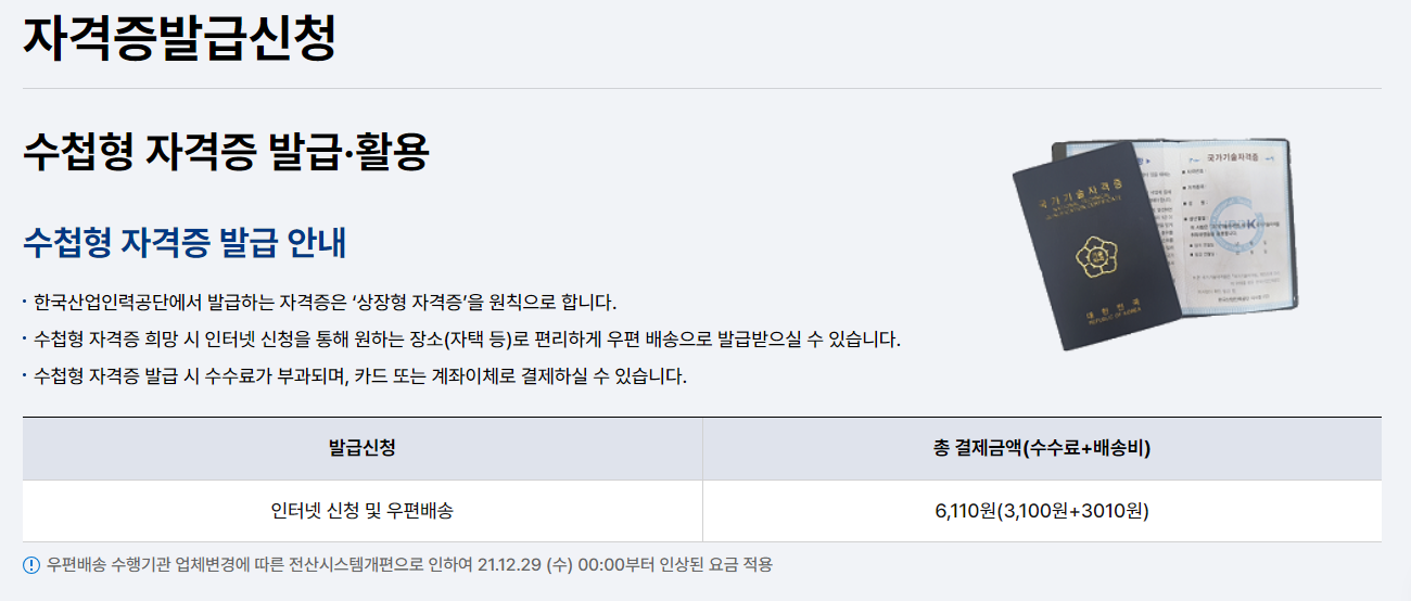 • 수첩형 자격증: 발급 신청 후 약 2~3주 내에 자택으로 자격증이 배송됩니다.