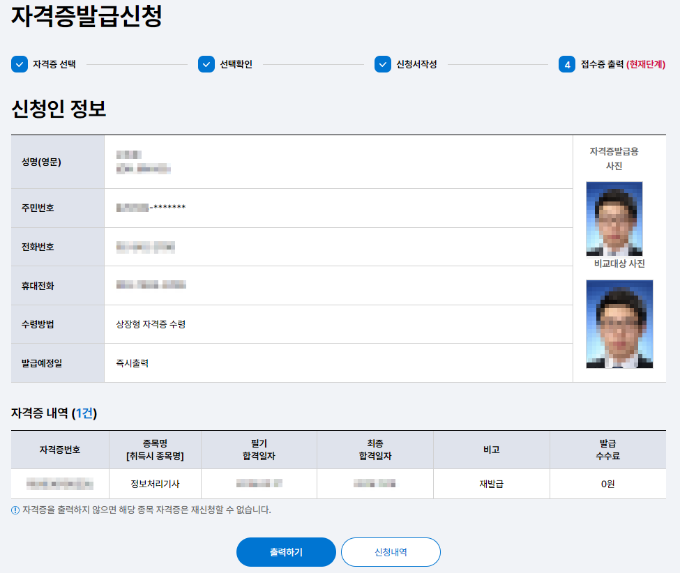 재발급 신청이 완료되면 마이페이지에서 진행 상황을 확인할 수 있으며, 발급이 완료되면 종이 자격증 또는 전자 자격증으로 수령할 수 있습니다.