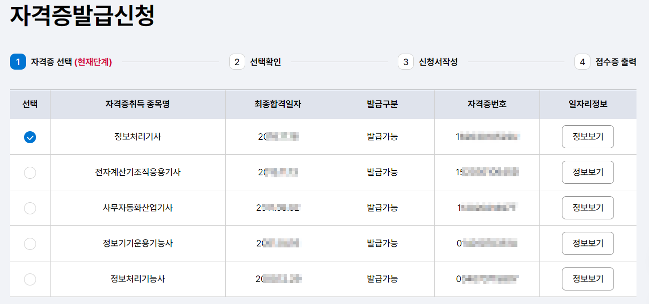 - 자격증 발급 메뉴에서 ‘재발급 신청’ 선택