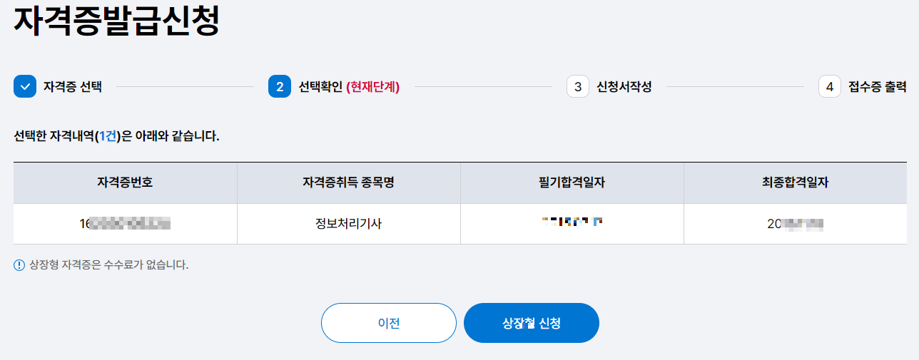 즉시 출력이 가능한 상장형 자격증을 예로 들겠습니다.