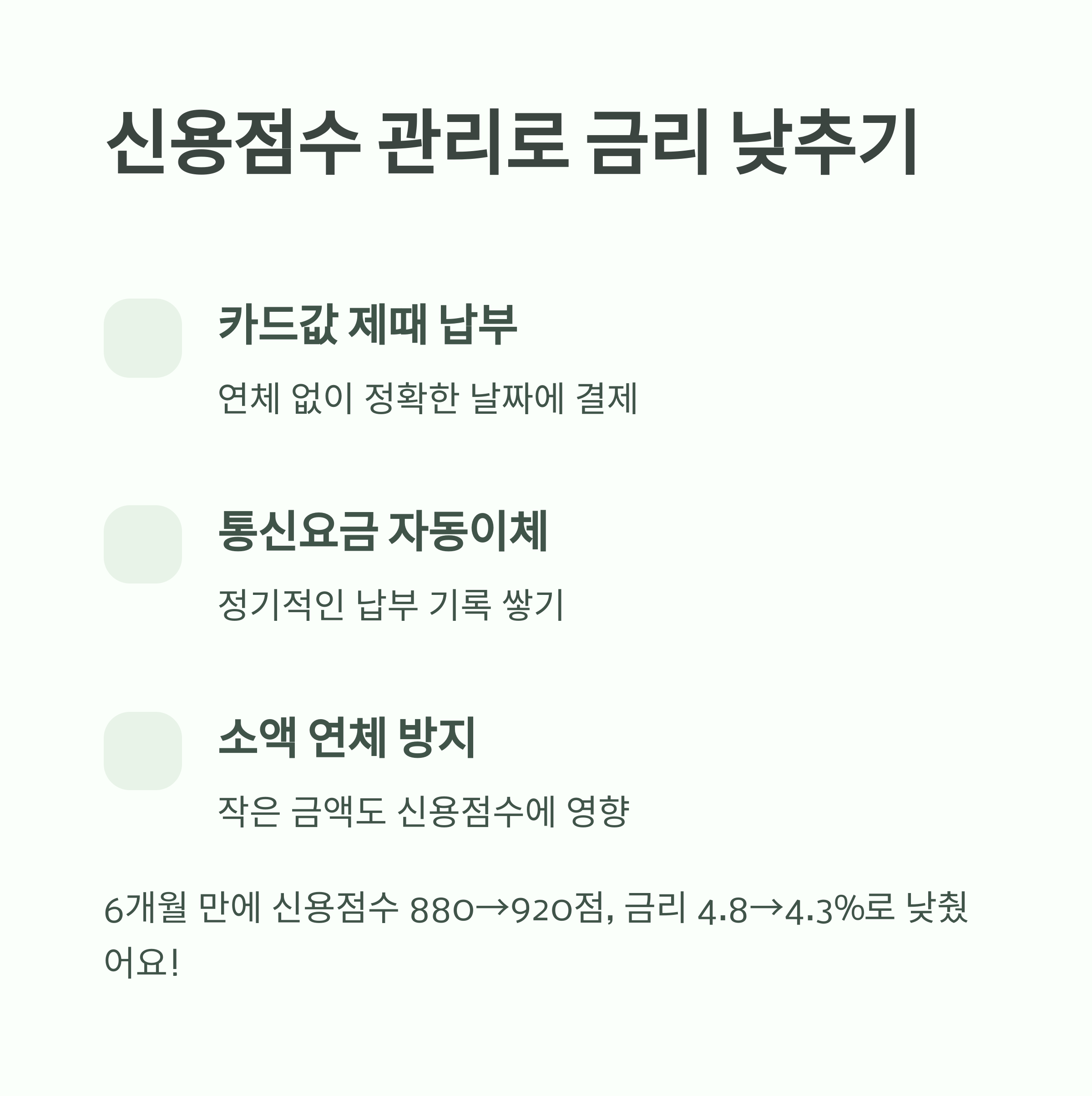 6개월 뒤 신용점수가 920점으로 올라갔고, 대출 금리도 재협상해서 4.3%까지 떨어졌어요.🎯 신용점수 1점 차이로 수십만 원이 왔다 갔다 한다는 사실, 직접 경험하고 정말 뼈저리게 느꼈습니다.