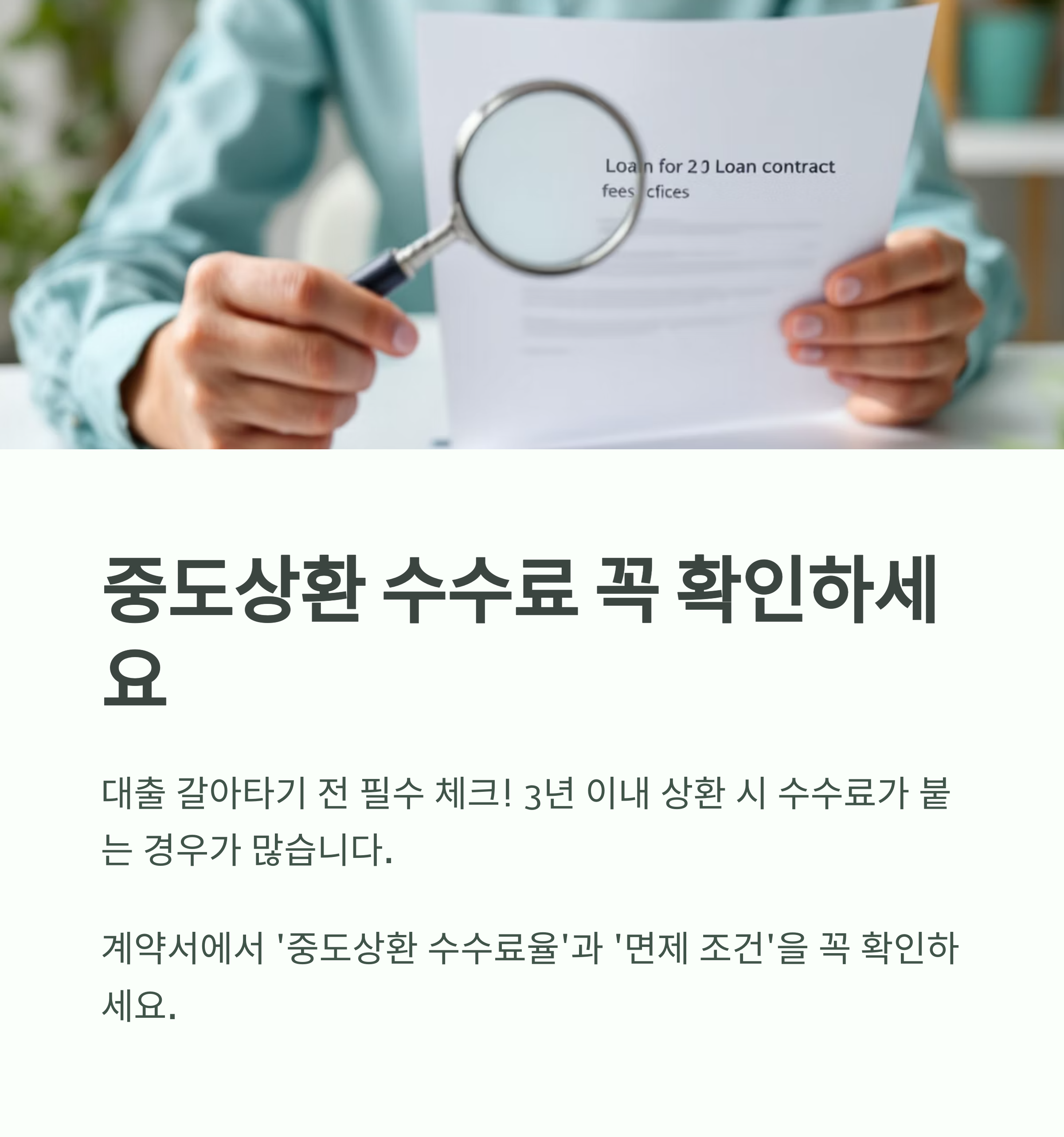 중도상환 수수료를 반드시 확인하고, 수수료보다 이자 절감액이 많을 때 해야 합니다.