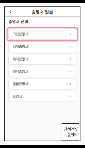 성적증명서, 졸업증명서, 재학증명서, 기타 증명서 등을 선택할 수 있습니다.