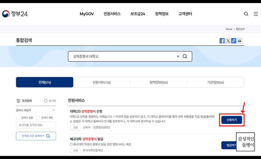 정부24 사이트에 접속한 후, '대학교 성적증명서'를 검색합니다. - 성적증명서 발급 선택