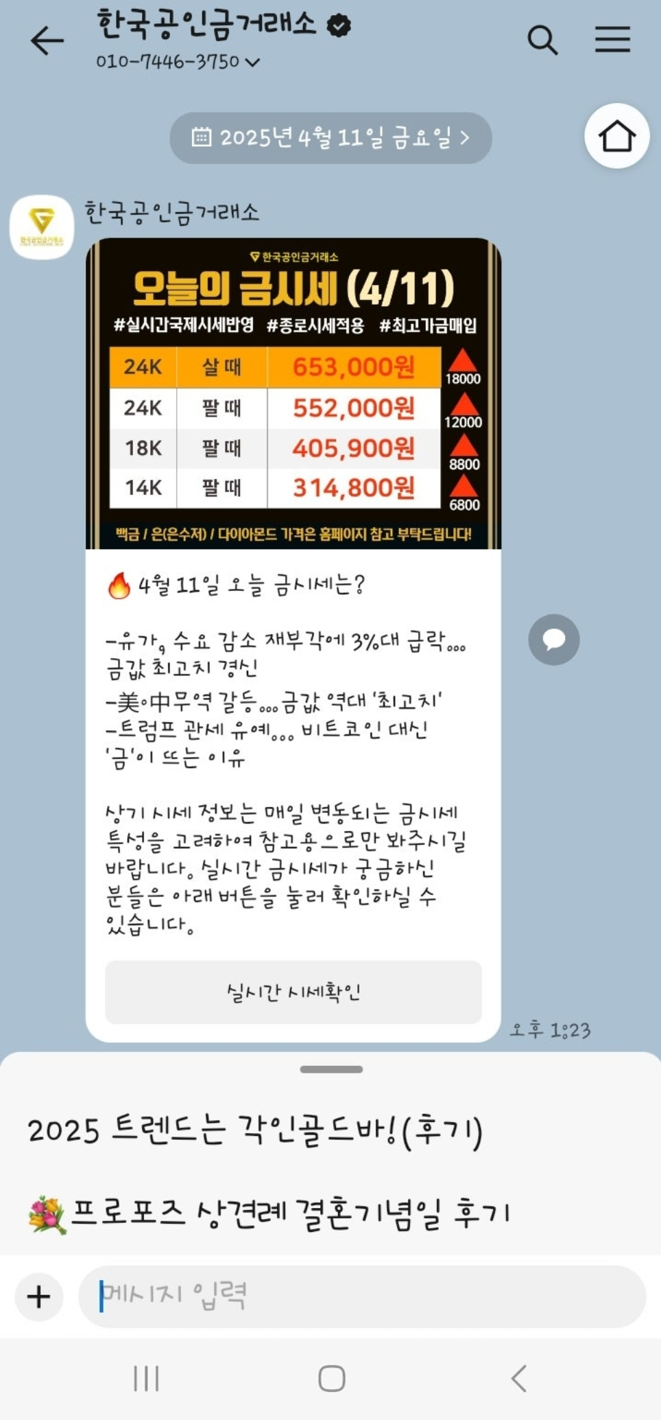 또한 카톡에 공인금거래소 친추하시면 매일 시세를 편하게 받아보실수 있어요.