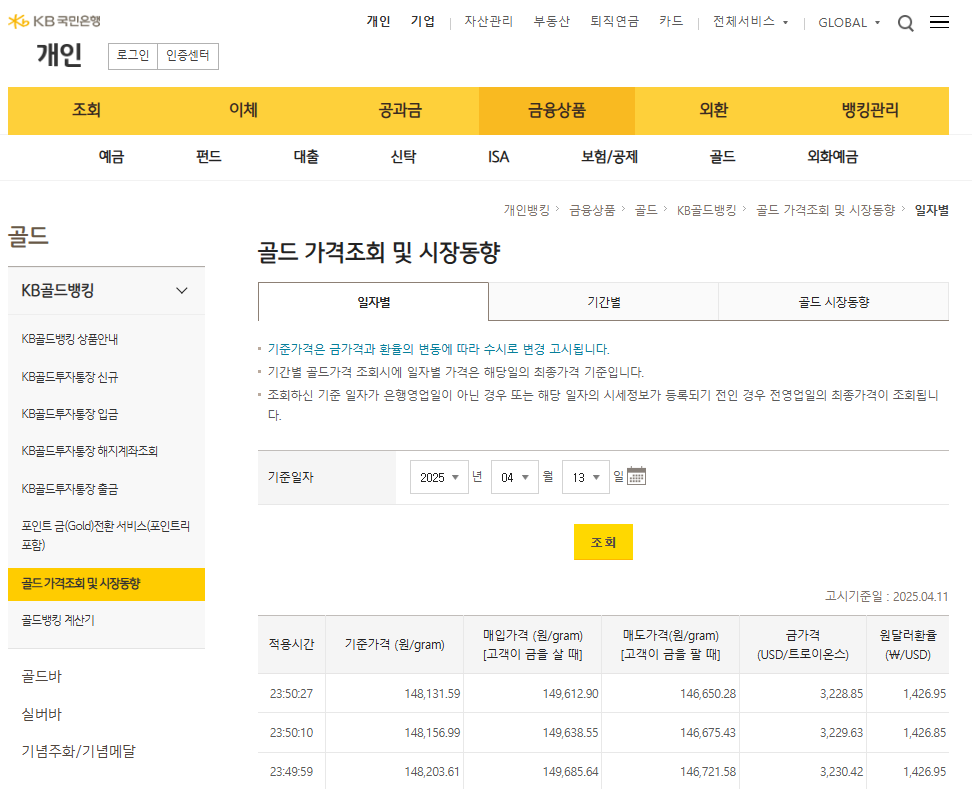 국내외 귀금속 시세 정보를 실시간으로 제공하며, 국제 시세도 확인할 수 있습니다. - KB국민은행 골드뱅킹