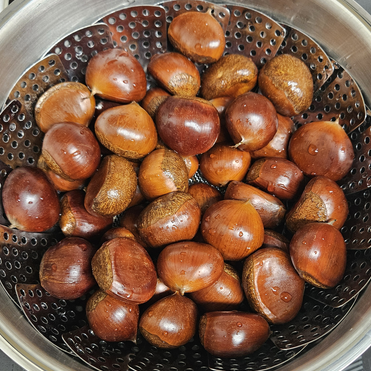 - 껍질을 벗긴 깐 밤을 찜기에 넣고 강불에서 5분간 쪄줍니다.