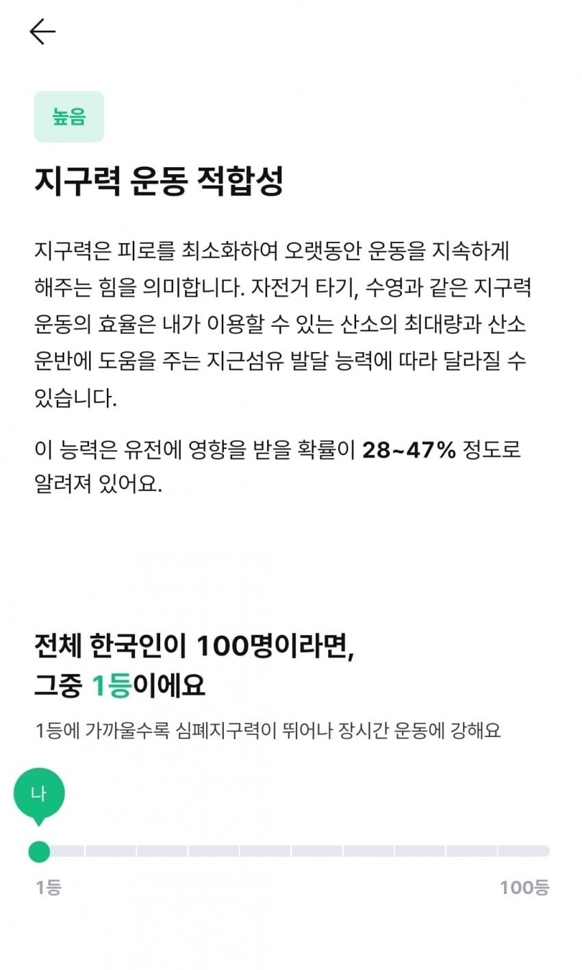 - 운동 스타일 조정 – 검사 결과에 따르면, 나는 근력보다는 지구력 운동이 더 적합한 체질이었다. 그래서 유산소 운동 시간을 늘려봤더니 체력 향상 효과가 컸다.