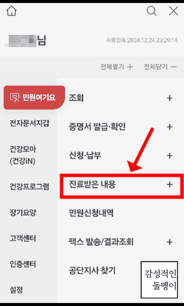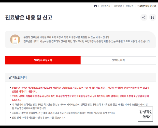 3. '진료받은 내용 및 신고' 메뉴를 선택하여 기록을 조회합니다. 👀