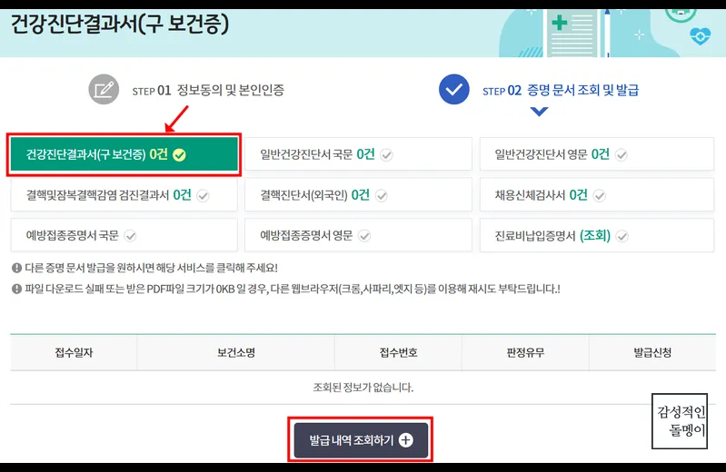 - 건강진단결과서(보건증) 조회 후 PDF 파일로 다운로드 또는 출력