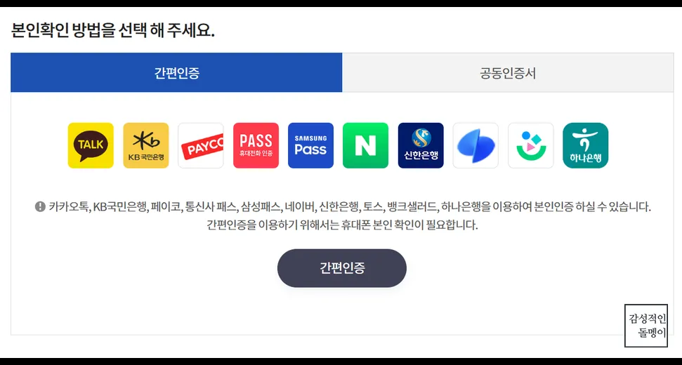 - 본인 인증(휴대폰 또는 공동인증서) 진행
