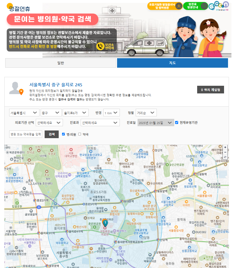 - 카카오맵: 마찬가지로 "명절 병원" 또는 "명절 약국"을 검색하면 됩니다.