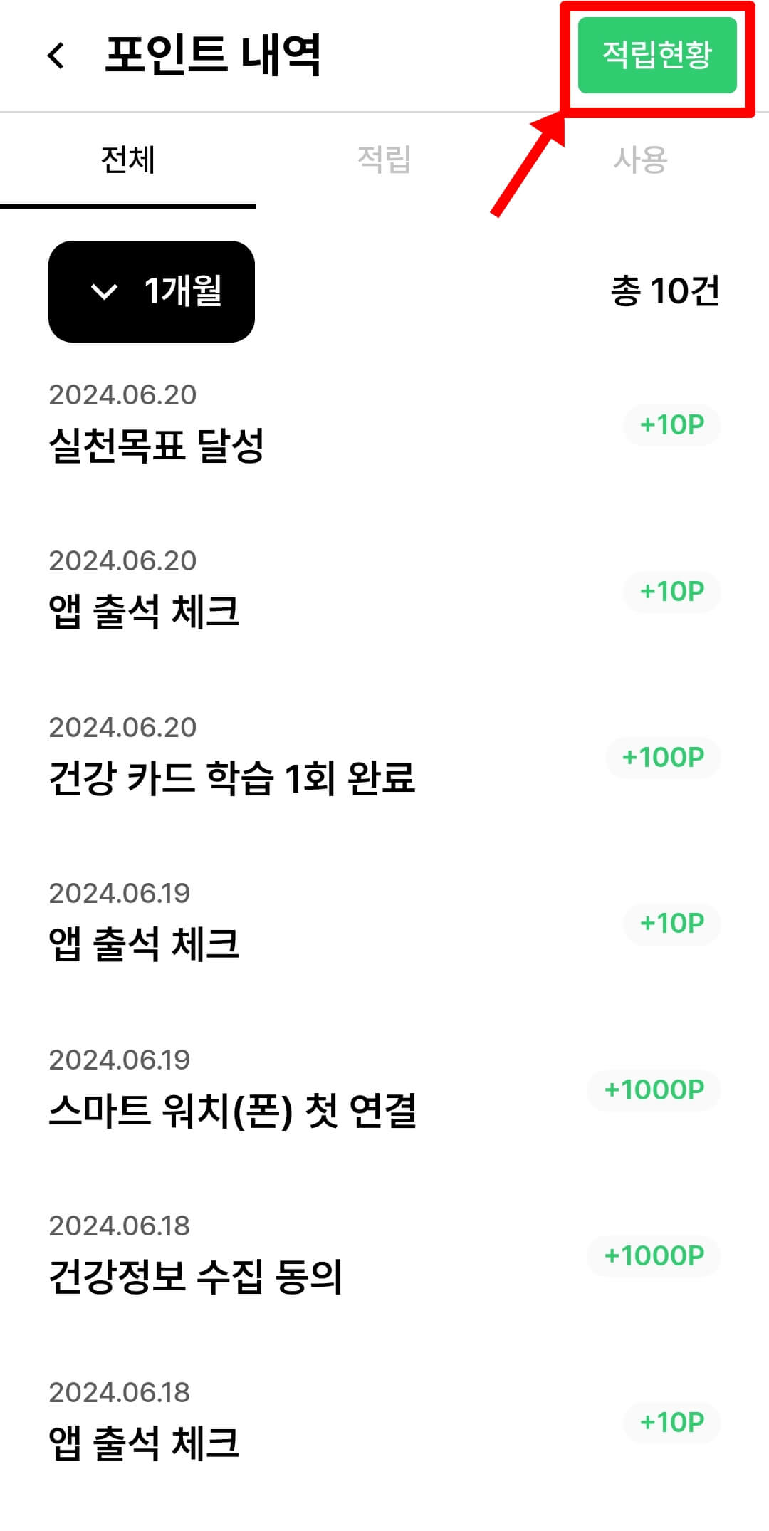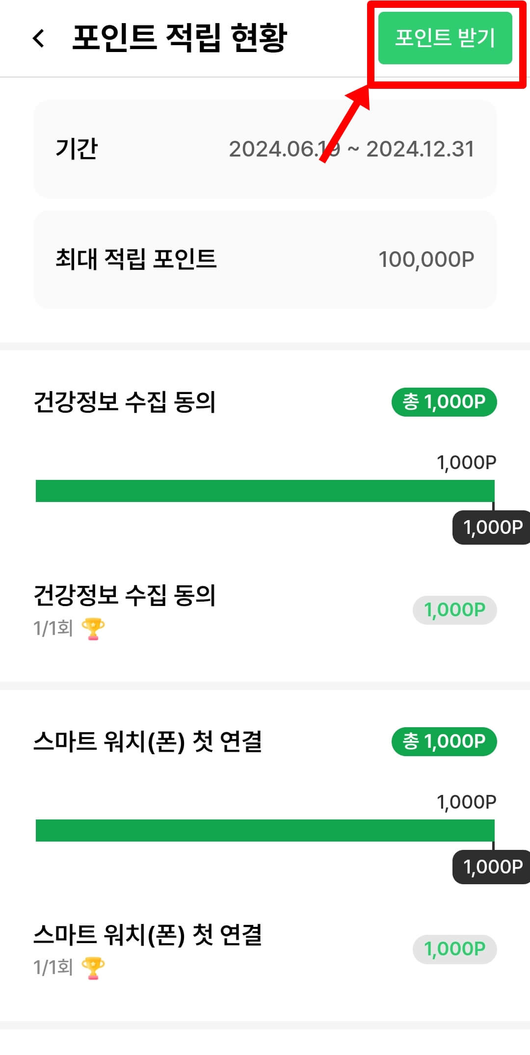 활동 포인트와 함께 추가 적립 방법도 다양합니다. 아래 순서대로 포인트 받기를 확인하여 건강 카드 학습, 식단 기록, 앱 출석 체크 등을 통해 추가 포인트를 획득할 수 있습니다.