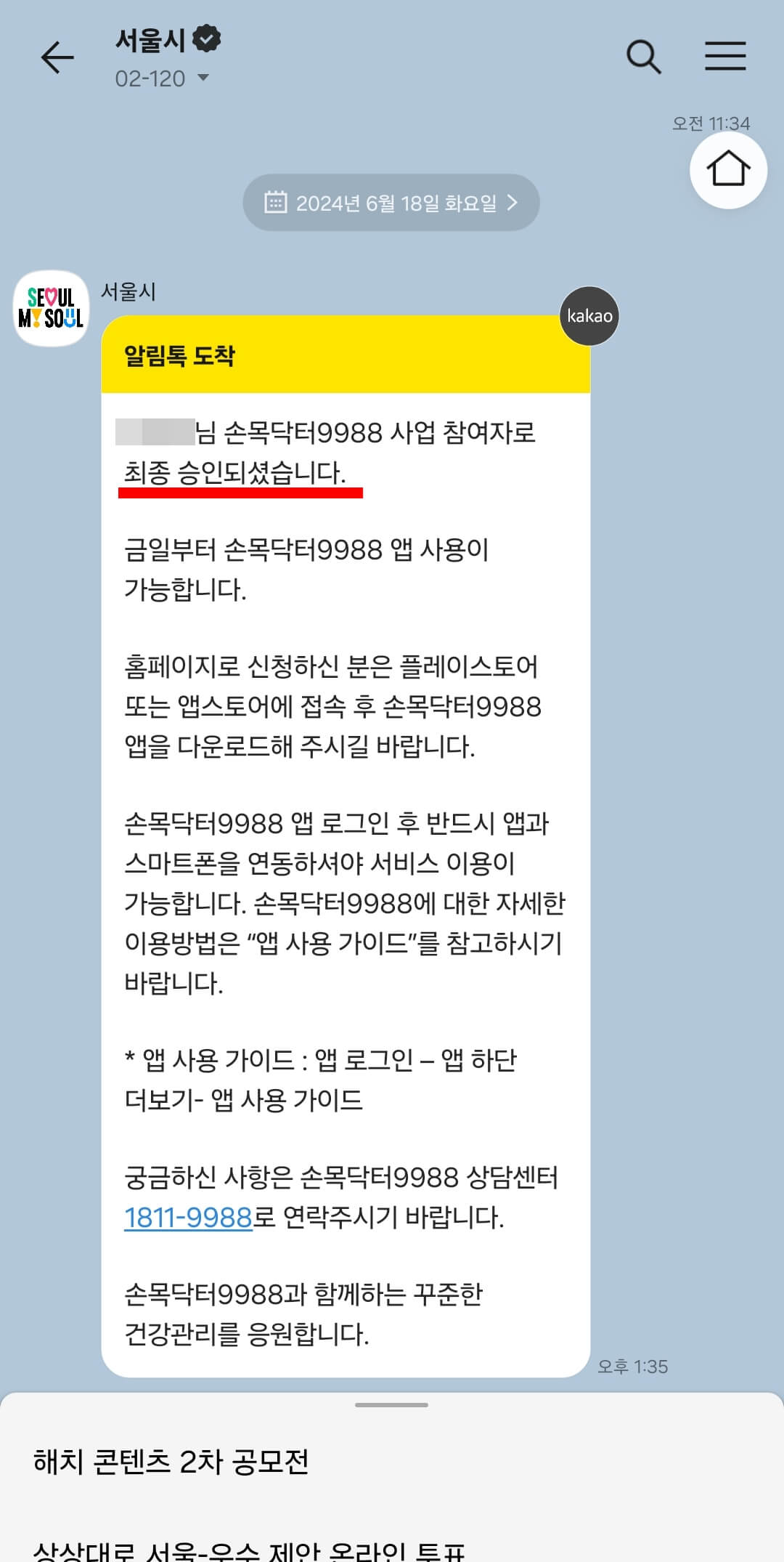 3. 서울시 승인 문자를 받은 후, 손목닥터9988에 로그인합니다. 간단한 기본정보 6문항 설문을 참여하여 1000P를 받을 수 있습니다.