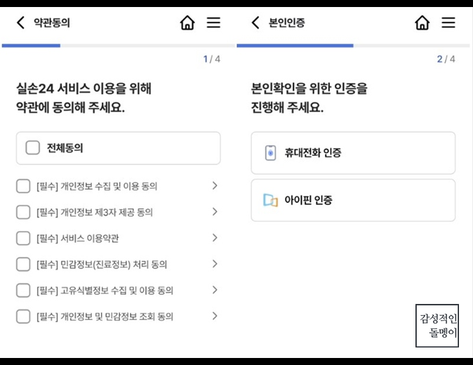 지난 주말, 병원에서 정기 검진을 받으신 엄마께서 "이번엔 네가 아닌 내가 해볼게!"라며 실손24 앱을 다운로드하셨습니다. 플레이스토어나 앱스토어에서 '실손24'를 검색하니 금세 앱을 찾을 수 있었습니다. 회원가입을 위해 약관 동의와 본인 인증을 진행하셨는데, 휴대전화 인증을 사용하시니 금방 끝났죠.
