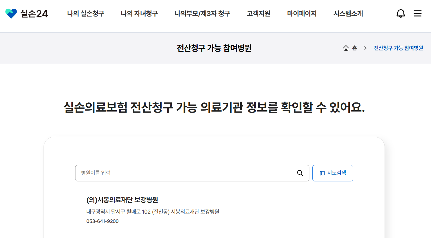 Tip! 병원이나 약국에 방문하기 전에 참여 병원인지 확인해 보세요! 실손24를 통해 전산 청구가 가능한지 바로 알 수 있습니다.