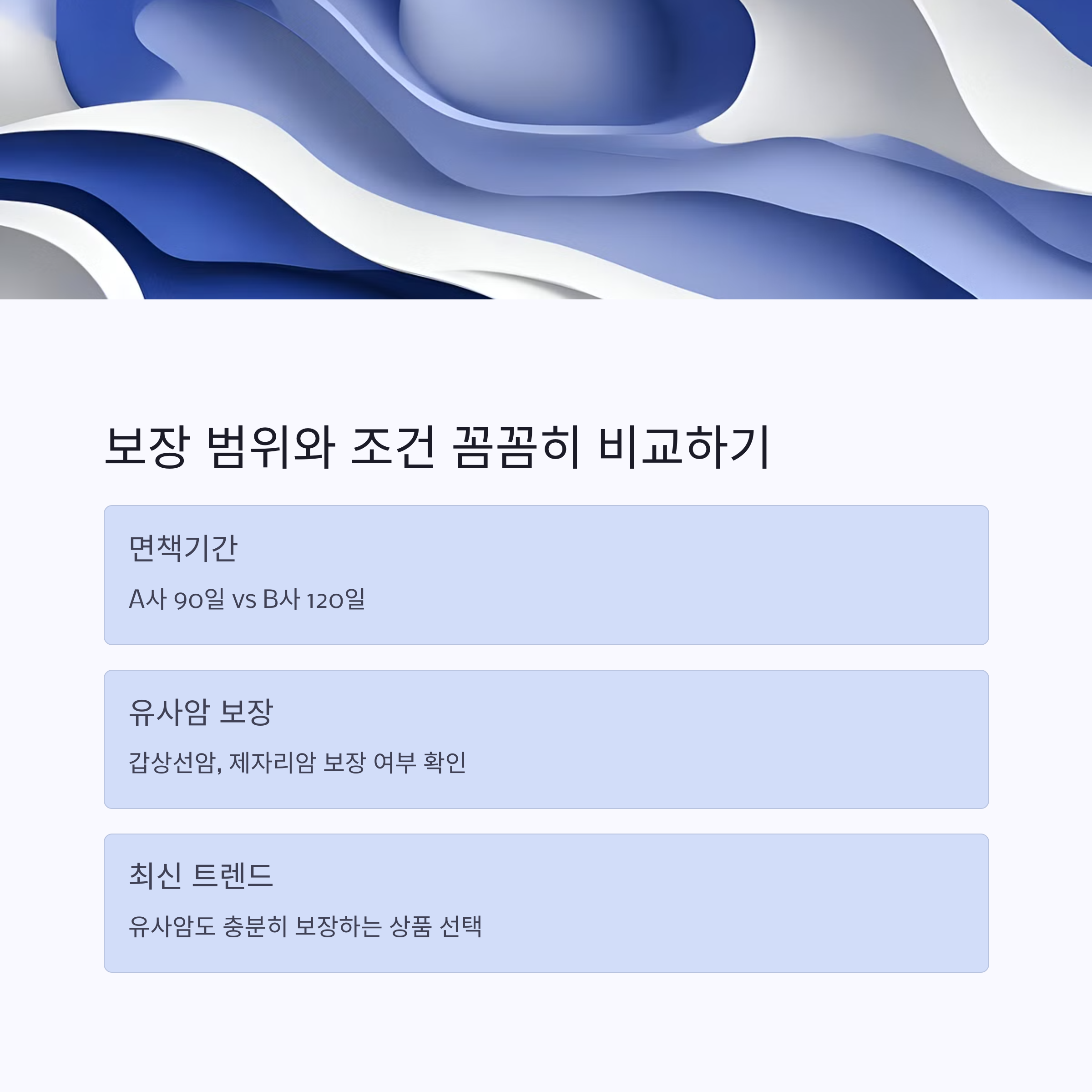 보험 상품마다 보장 범위와 면책 조건이 천차만별이에요. 예를 들어, A사는 90일 면책기간을 두는 반면, B사는 120일입니다.