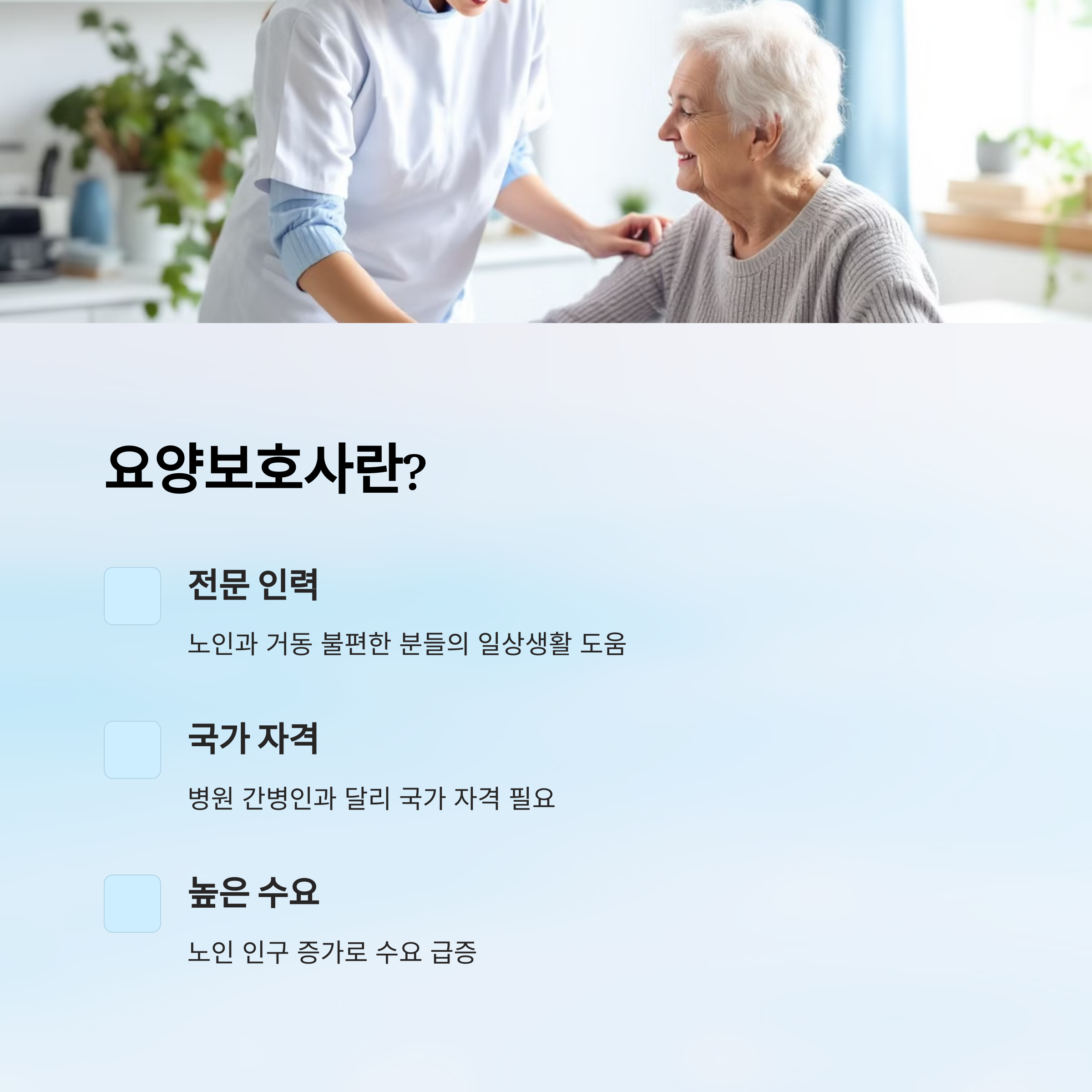 최근엔 1인 가정의 증가, 노인 인구 증가로 인해 요양보호사의 수요가 정말 빠르게 늘고 있어요. 실제로 저희 동네 요양센터도 항상 인력이 부족하다고 하더라고요!