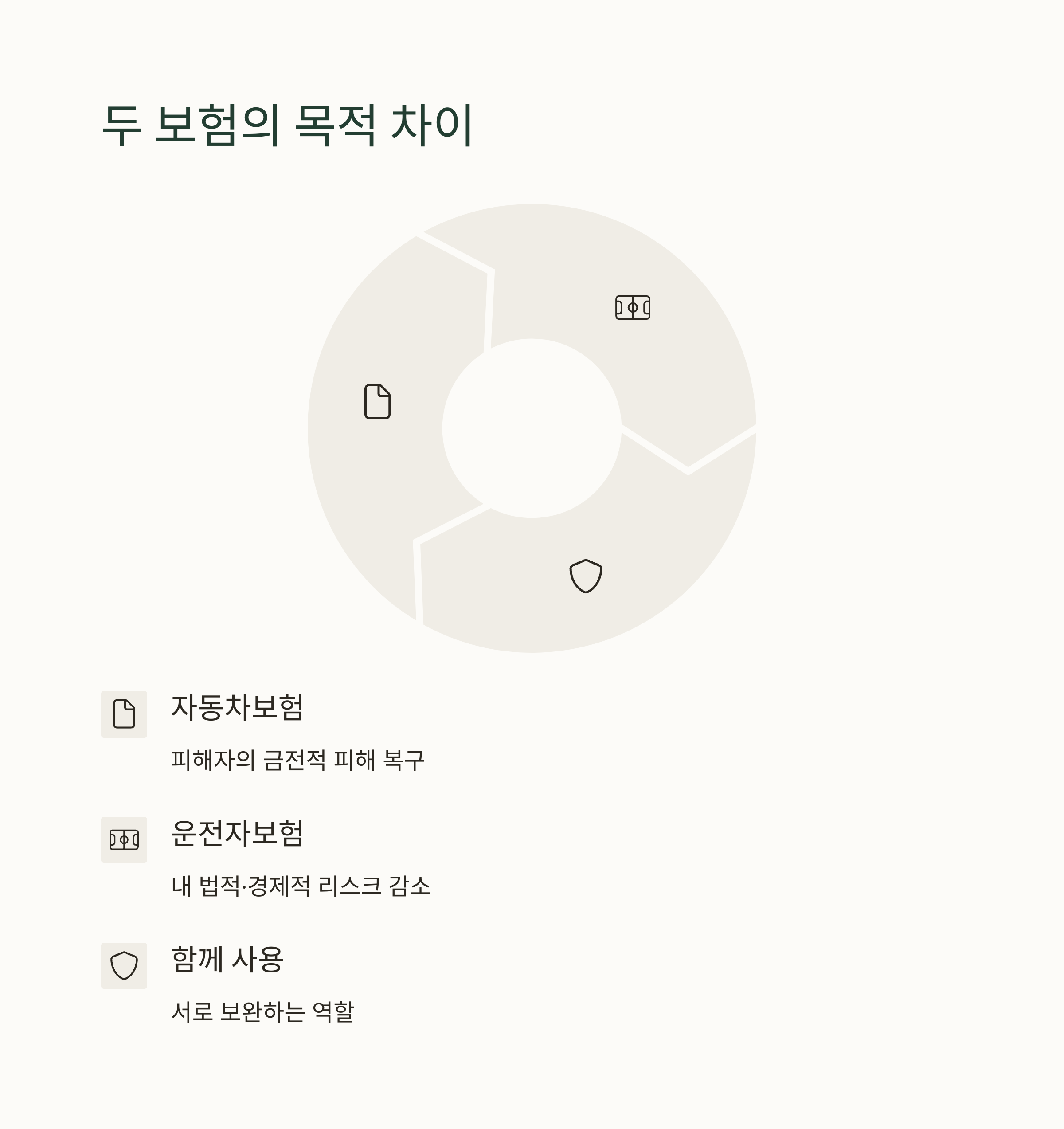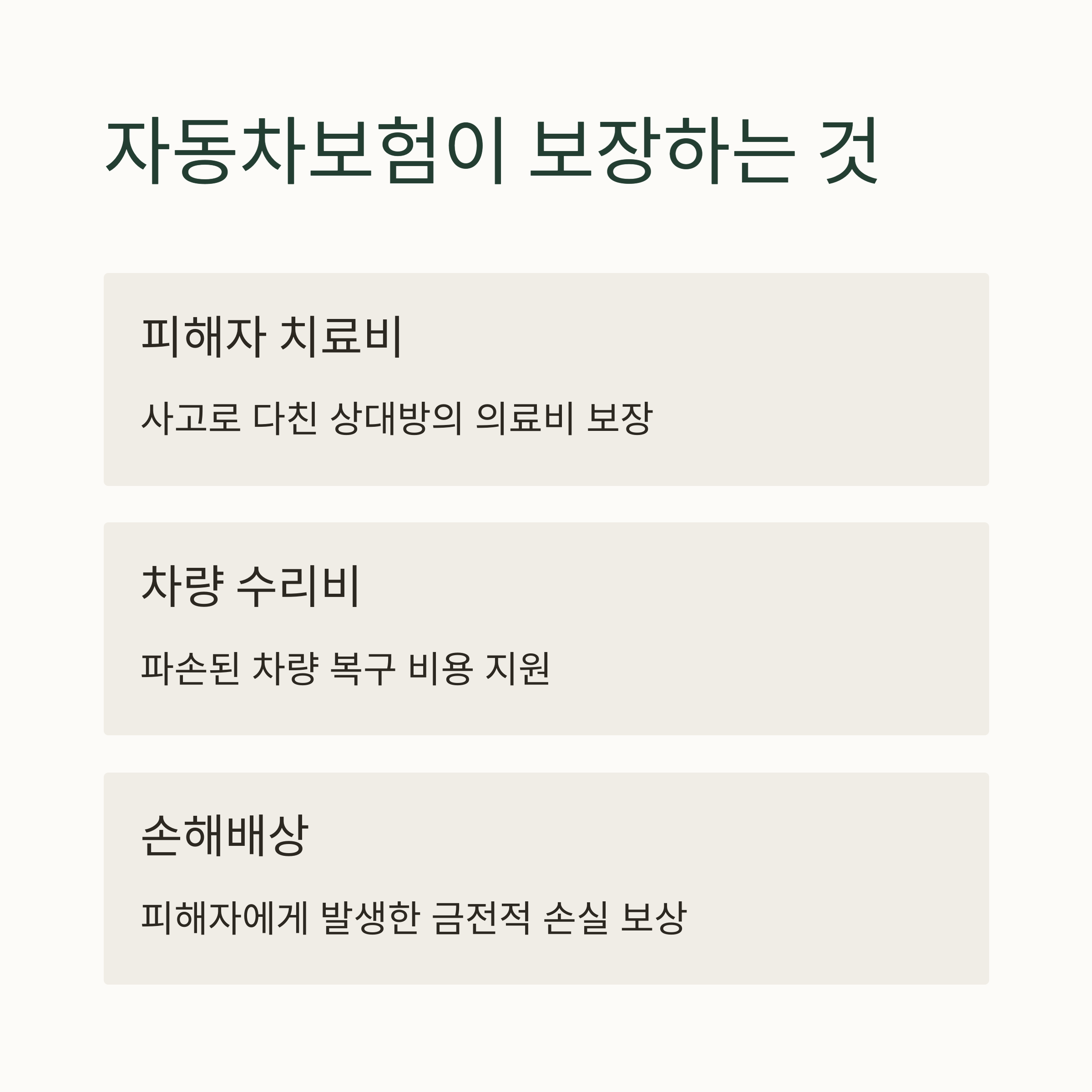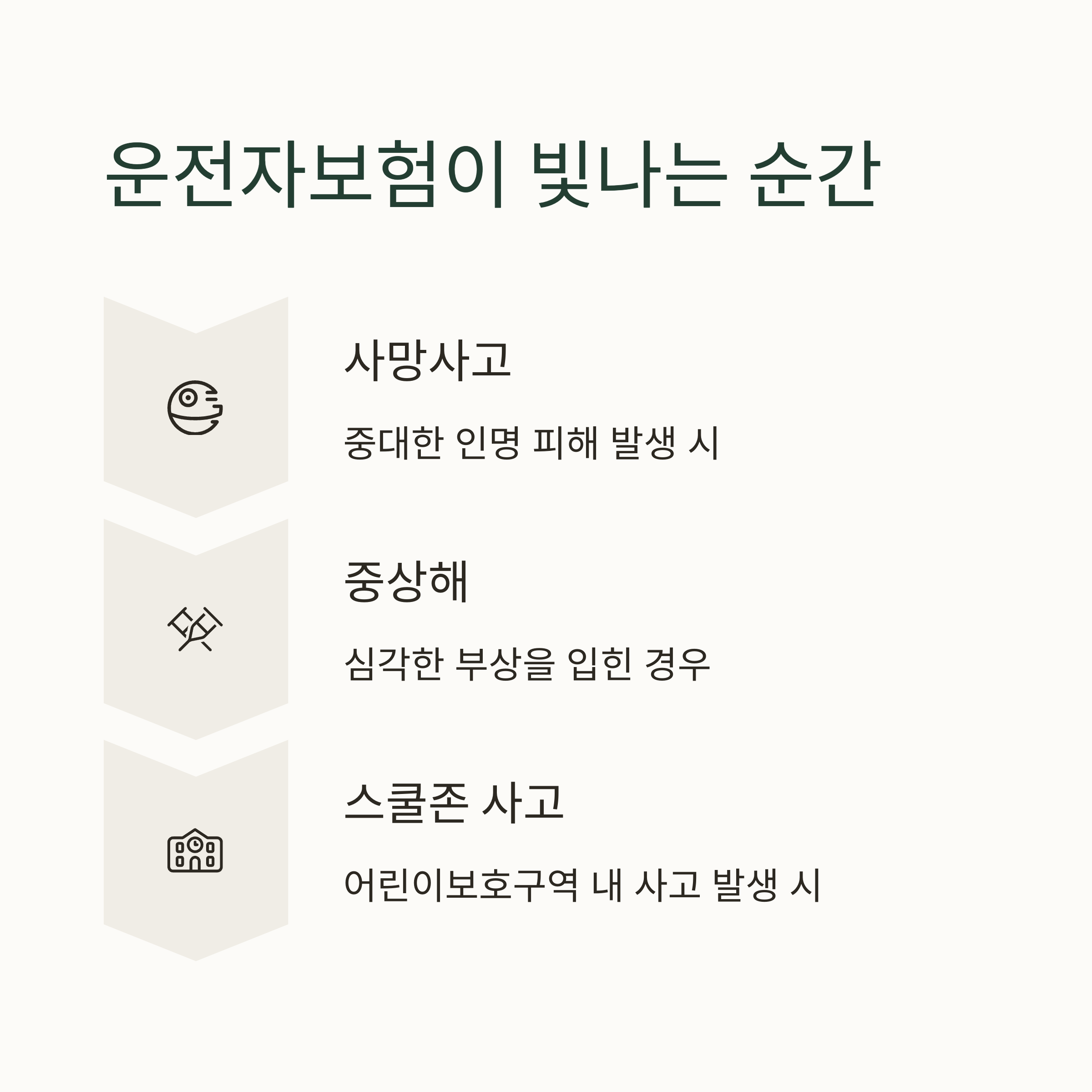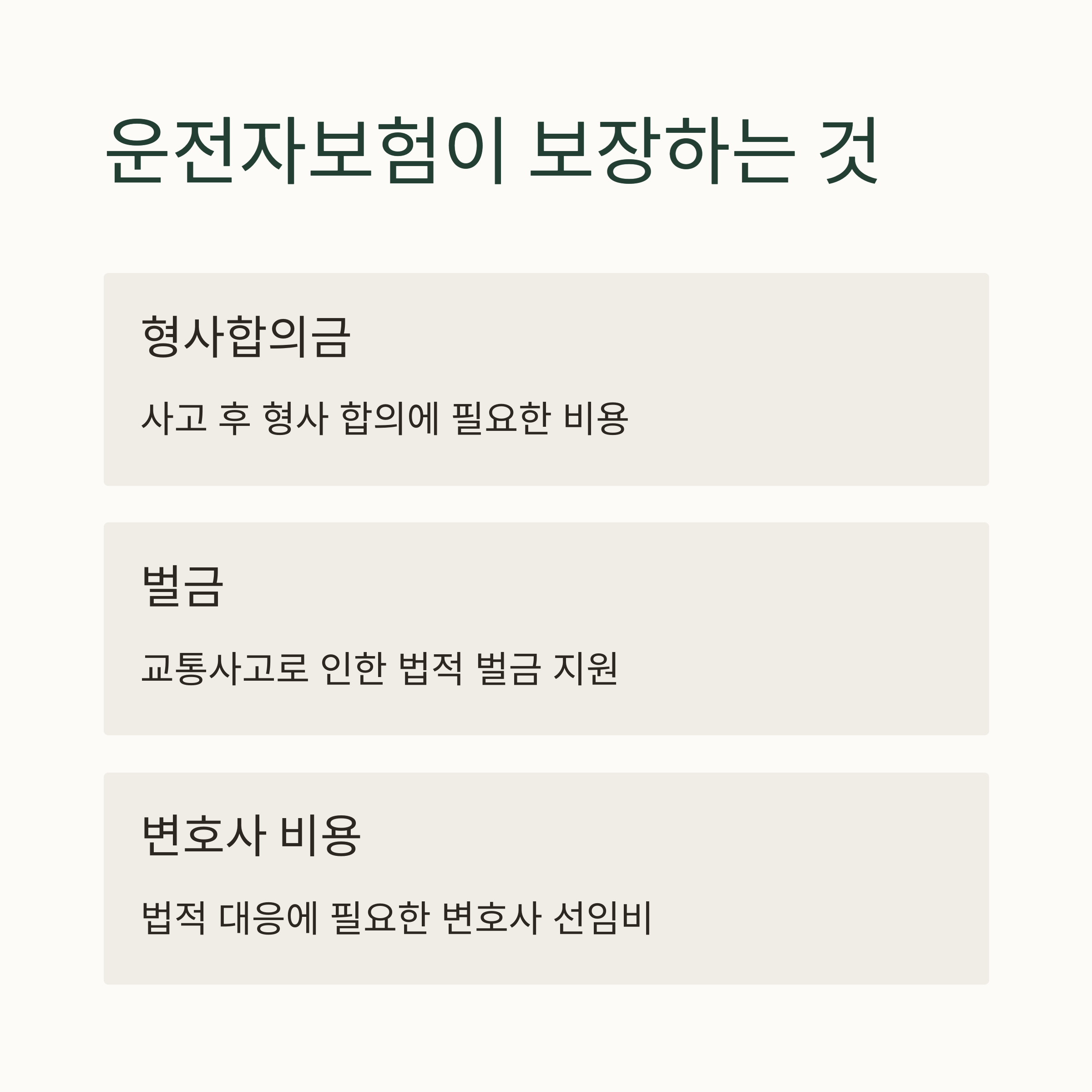 - 운전자보험은 이 세 가지를 집중적으로 보장합니다.