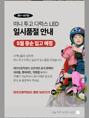 저는 판교 스쿳앤라이드 매장과 하남 마이크로 매장에서 아이와 킥보드를 타보았습니다. 그리고 고민 끝에 2가지의 포인트 때문에 마이크로 미니투고를 선택하였습니다.