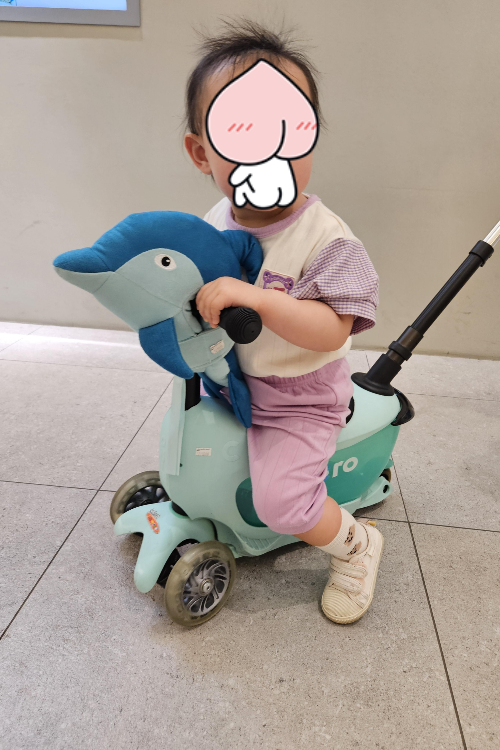 첫 번째 포인트는 푸쉬바 입니다. 아직 20개월 된 아기이다 보니 안정적으로 킥보드를 타진 못합니다. 그래서 킥보드를 뒤에서 잡아줄 수 있는 푸쉬바 덕분에 아기가 안정적으로 미니투고를 탈 수 있었습니다.