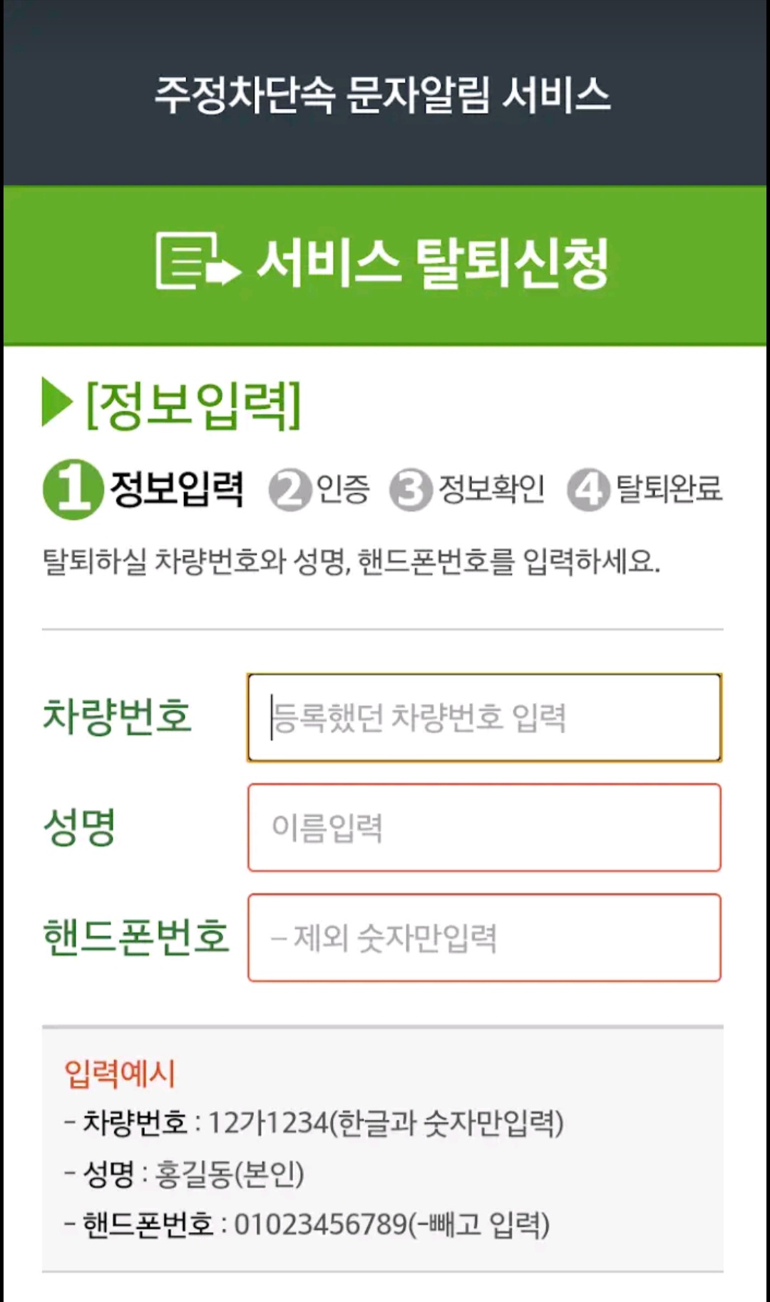 - 차량번호, 성명, 휴대폰 번호 등 필수 정보 입력