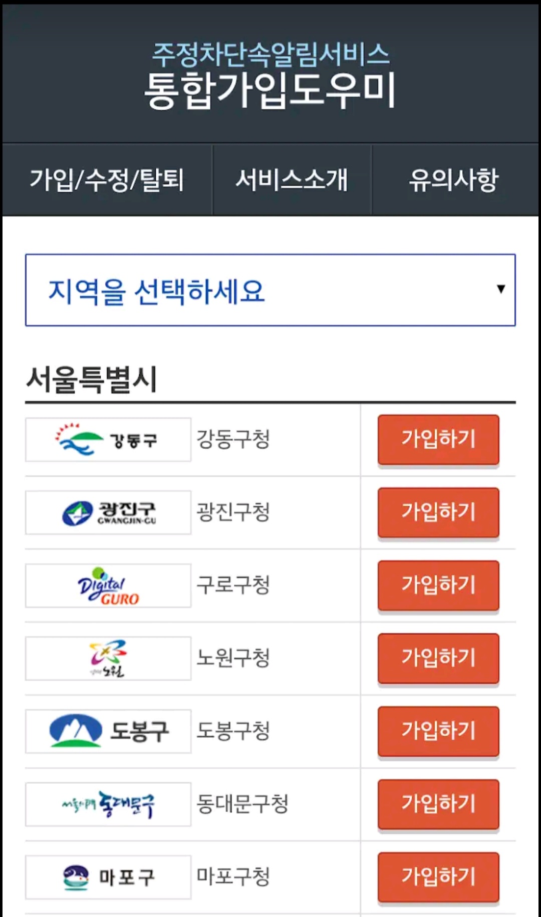 - 구글 플레이 스토어나 앱스토어에서 '주정차단속 알림서비스 전국가입도우미' 앱 다운로드