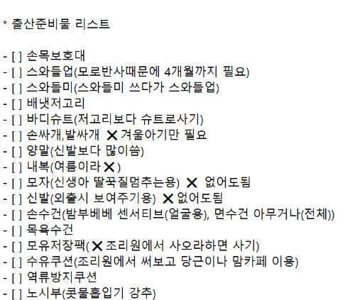 저 같은 경우 엑셀보다는 텍스트 문서로 관리하였던 이유는 남편과 크로스 체크하면서 카톡으로 쉽게 주고 받기위해 텍스트로 관리하였습니다. 제가 사용했던 출산 체크 리스트 공유드립니다.