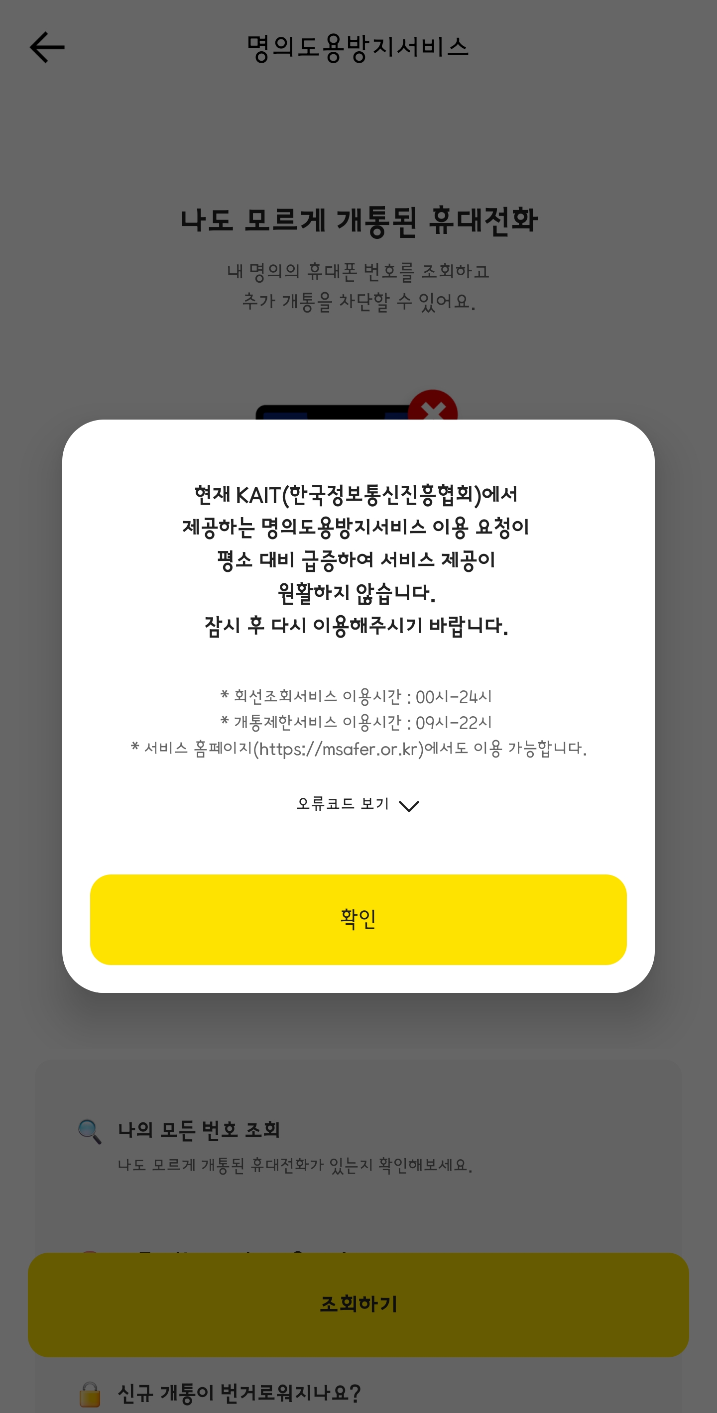 아래와 같은 화면이 나온다고 당황하지 마세요. 사용자가 많아 발생하는 문제지만 계속 시도하면 간편 인증으로 넘어갈 수 있습니다.