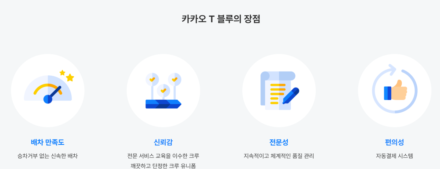 카카오에서 정해놓은 평점, 운행 이력, 고객 응대 평가 등을 기준으로 일정 수준 이상인 기사님만 블루 운행을 할 수 있어요. 그래서 전반적인 서비스 품질이 더 좋습니다.
