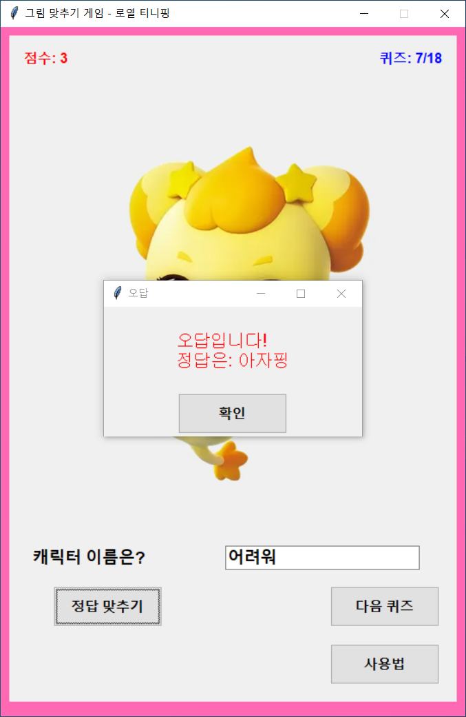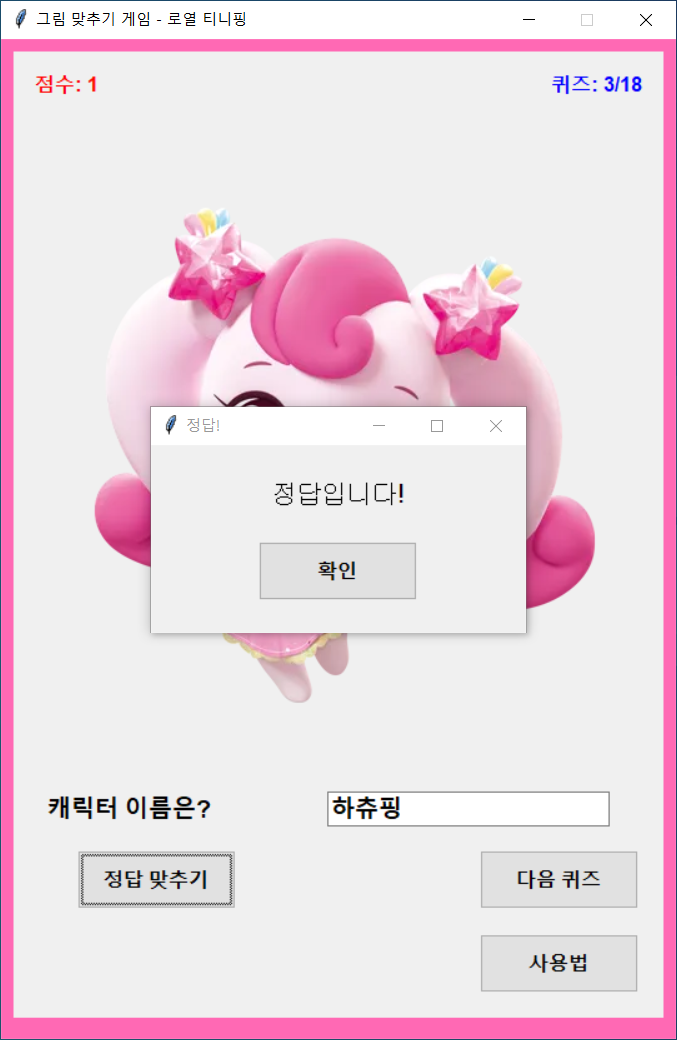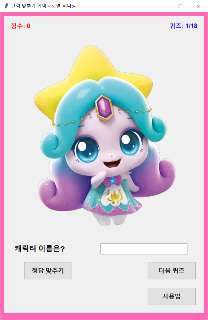 - 저작권 문제로 이미지는 직접 추가해야 합니다. 게임을 실행하기 전에 image라는 폴더를 만들고, 나무위키에서 쉽게 구할 수 있는 티니핑 캐릭터 이미지를 넣어주세요.