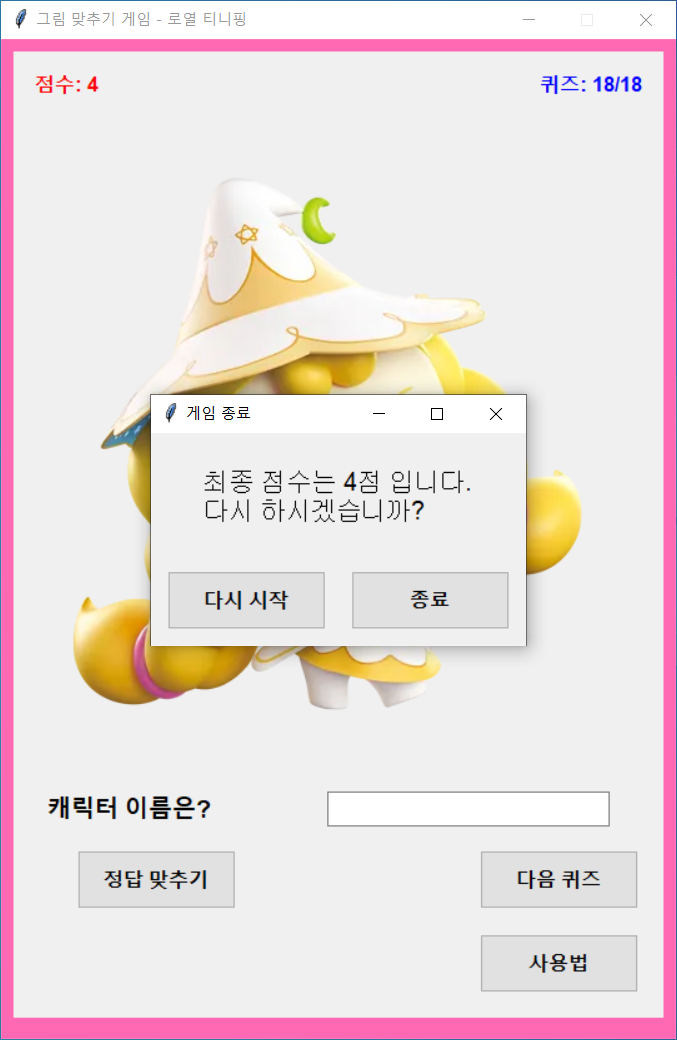 - 저작권 문제로 이미지는 직접 추가해야 합니다. 게임을 실행하기 전에 image라는 폴더를 만들고, 나무위키에서 쉽게 구할 수 있는 티니핑 캐릭터 이미지를 넣어주세요.