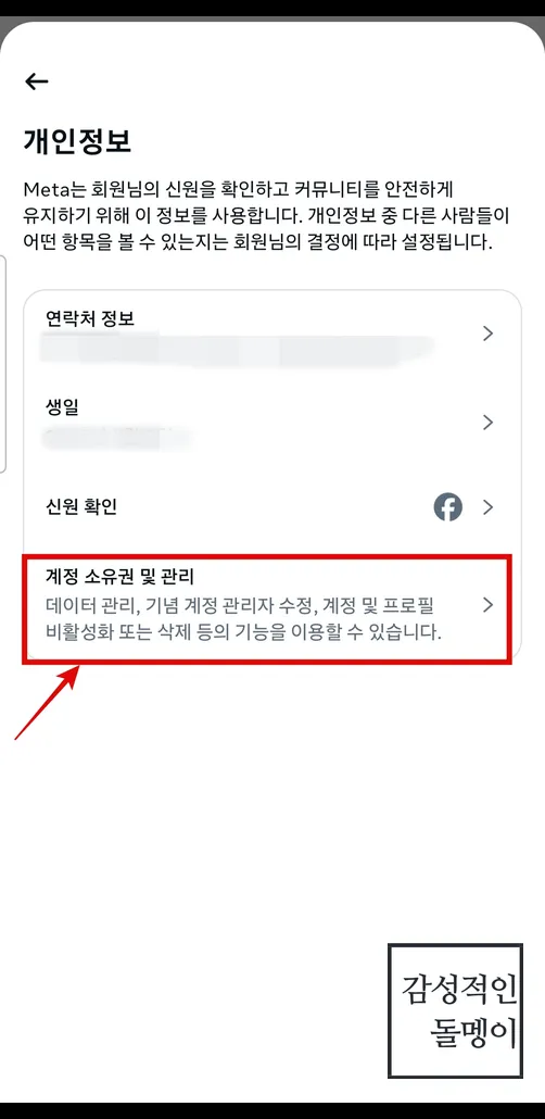 - 계정 센터 → 개인 정보 → 계정 소유권 및 관리 클릭