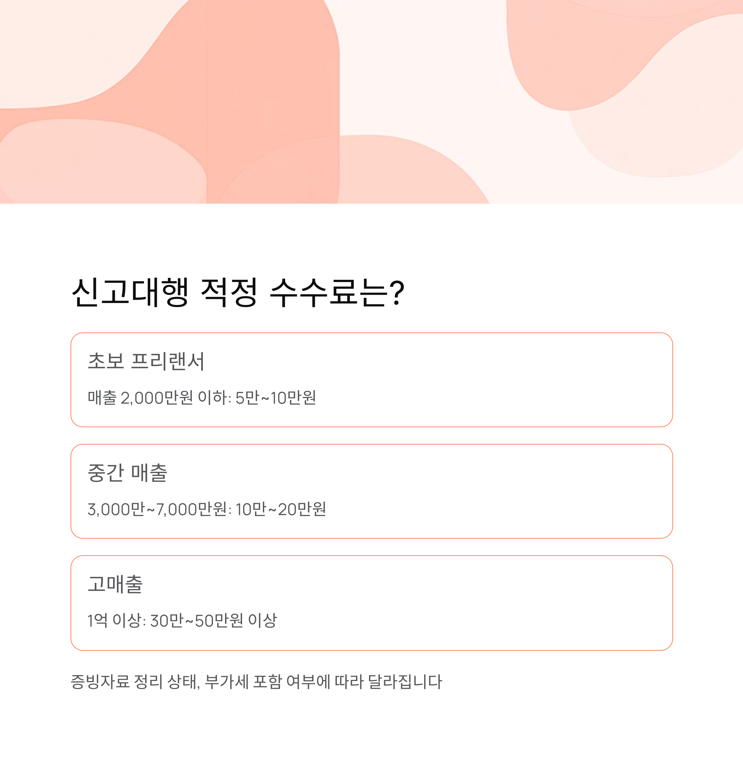 수수료는 매출 규모뿐 아니라, 지출 증빙 자료 정리 상태, 부가세 포함 여부, 기장의 유무 등에 따라 달라져요.