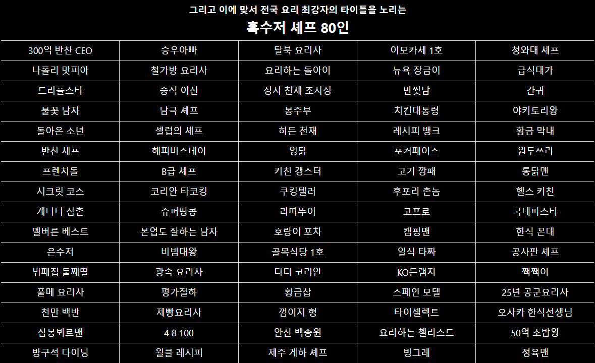 숨은 인재 발굴: 유명 셰프들 외에도 숨겨진 실력자들에게 기회를 제공하여, 새로운 요리 인재를 발굴합니다.