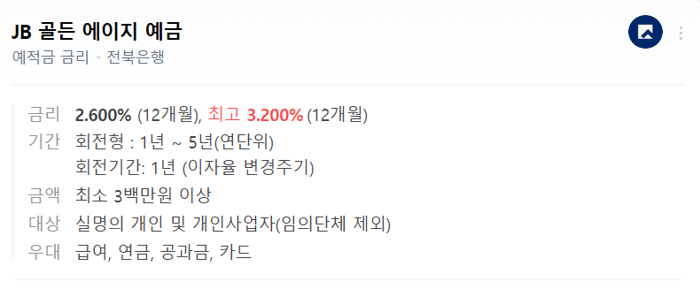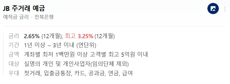 🏦 전북은행 JB 주거래 예금 – 기본 2.65%, 최고 3.20%