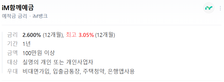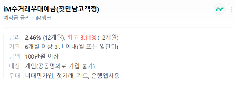 📱 iM뱅크 iM주거래우대예금(첫만남고객형) – iM뱅크 주력 상품