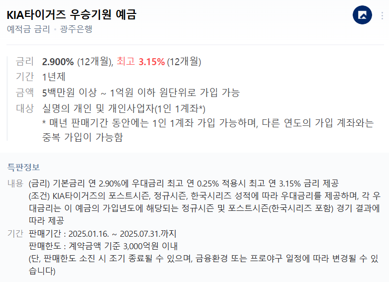 기본금리 2.90%에, 우대 적용 시 최고 3.11%까지 가능해요. 이름부터 눈길을 끄는 이 예금은 KIA 타이거즈 우승을 기원하며 만든 특판 상품인데요, 저 같은 야구팬에겐 소소한 재미이자 응원까지 되는 예금이에요! 🧡