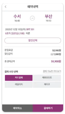 - 할인쿠폰 사용 가능: 승차권 선물하기, 실적 적립, 할인쿠폰 적용 가능