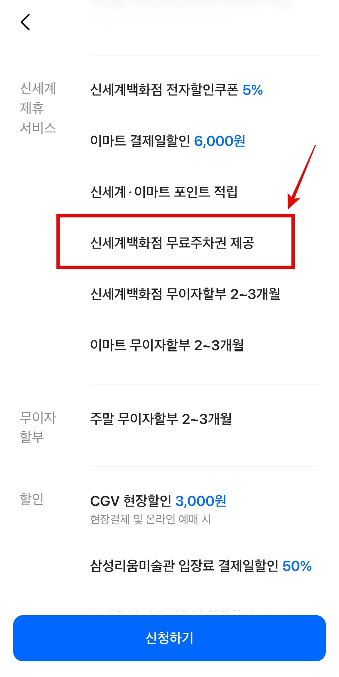신세계 삼성카드를 보유한 고객은 월 최대 6장, 2시간 무료 주차권을 받을 수 있습니다. 일반 삼성카드보다 혜택이 크기 때문에 자주 백화점을 방문하신다면 고려해볼 만한 카드예요.