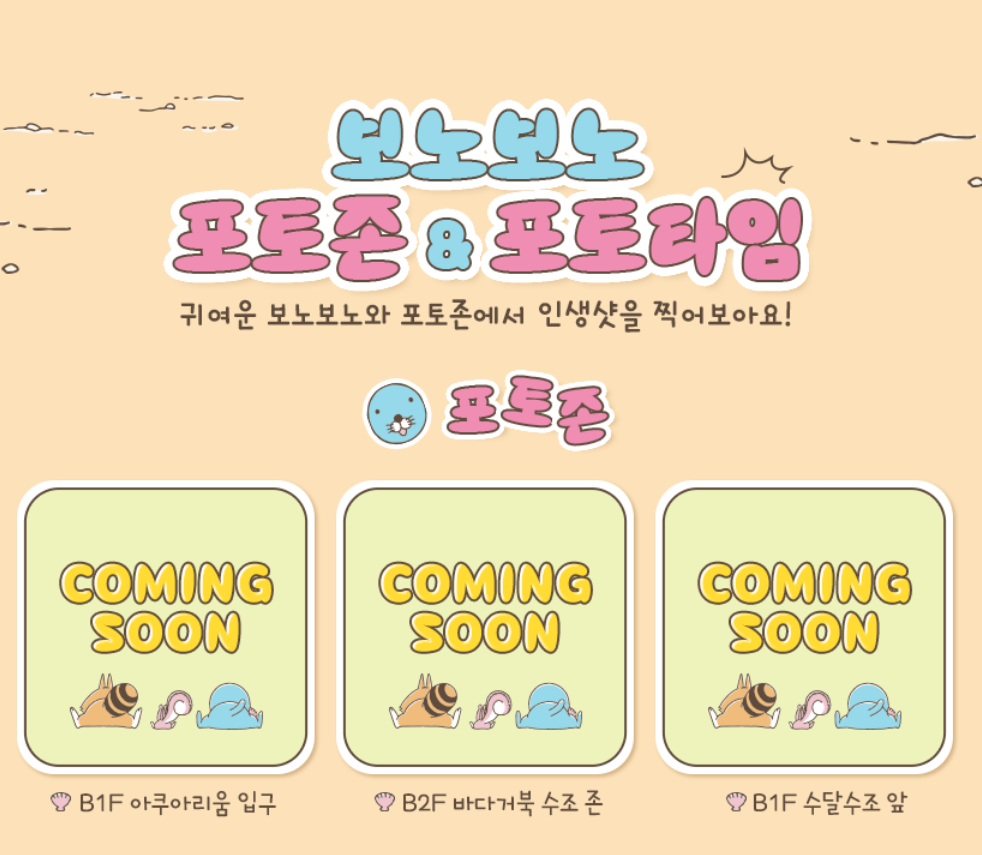 잠실에 위치한 롯데월드 아쿠아리움은 아이들에게 바닷속 세계를 직접 보여줄 수 있는 곳이에요. 다양한 해양 생물을 가까이서 볼 수 있을 뿐만 아니라, 이번에는 곳곳에 마련된 보노보노 포토존에서 특별한 사진을 남길 수 있어요. 특히, 도토리숲 매장은 아이들이 좋아하는 캐릭터와 함께 사진을 찍을 수 있는 공간으로 유명하답니다. 아쿠아리움 관람 후 도토리숲에서 아이와 함께 즐거운 시간을 보내보세요.